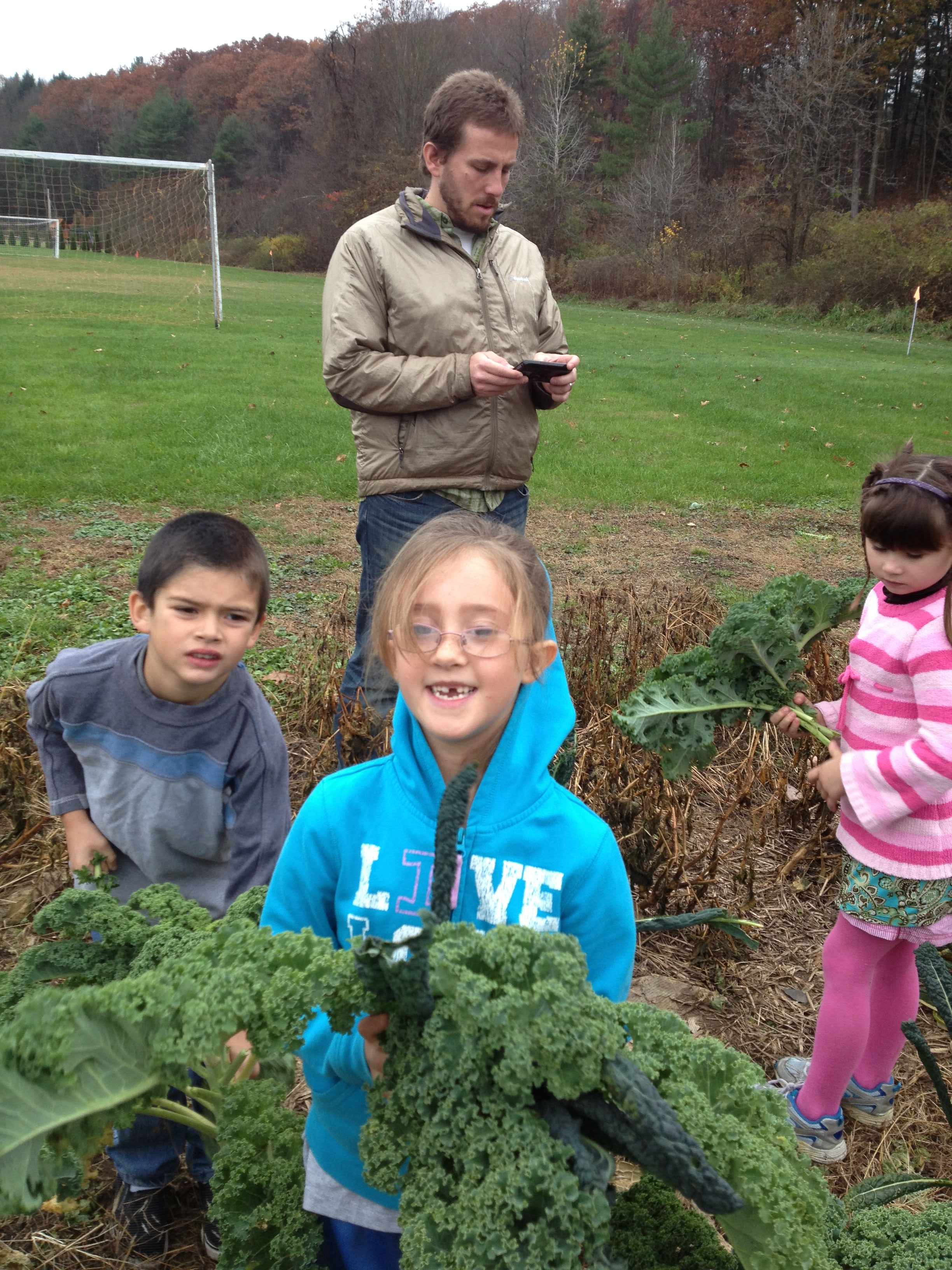 The second graders came out to trim back the kale they had planted last spring, composting the unusable leaves on the ground and picking the crisp green ones for a kale party after the Halloween parade.