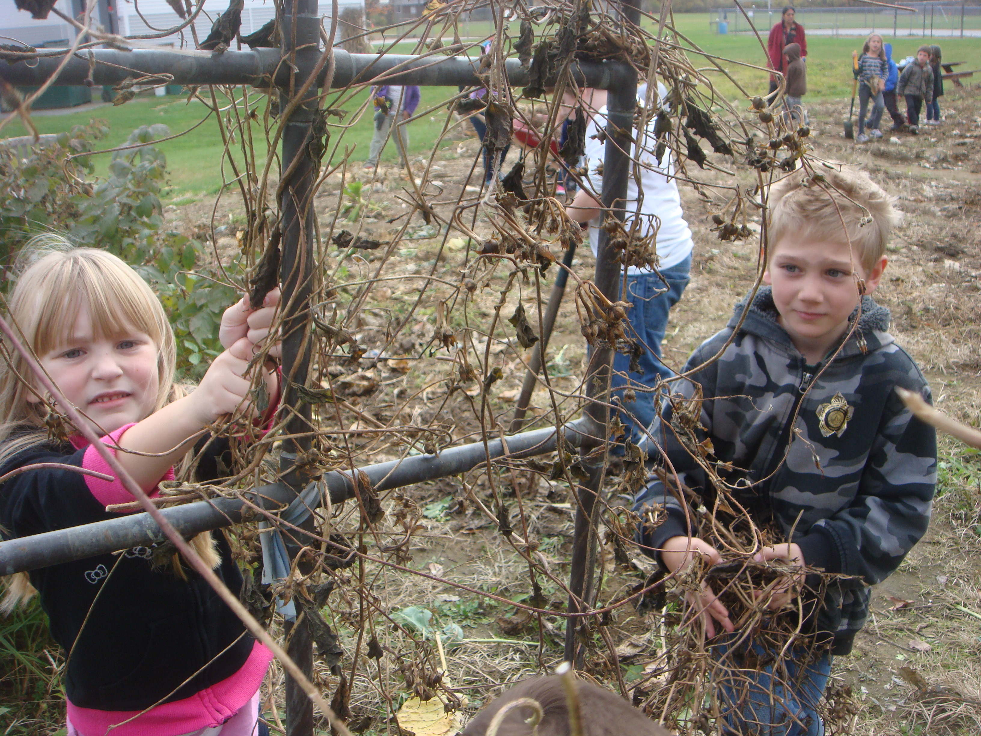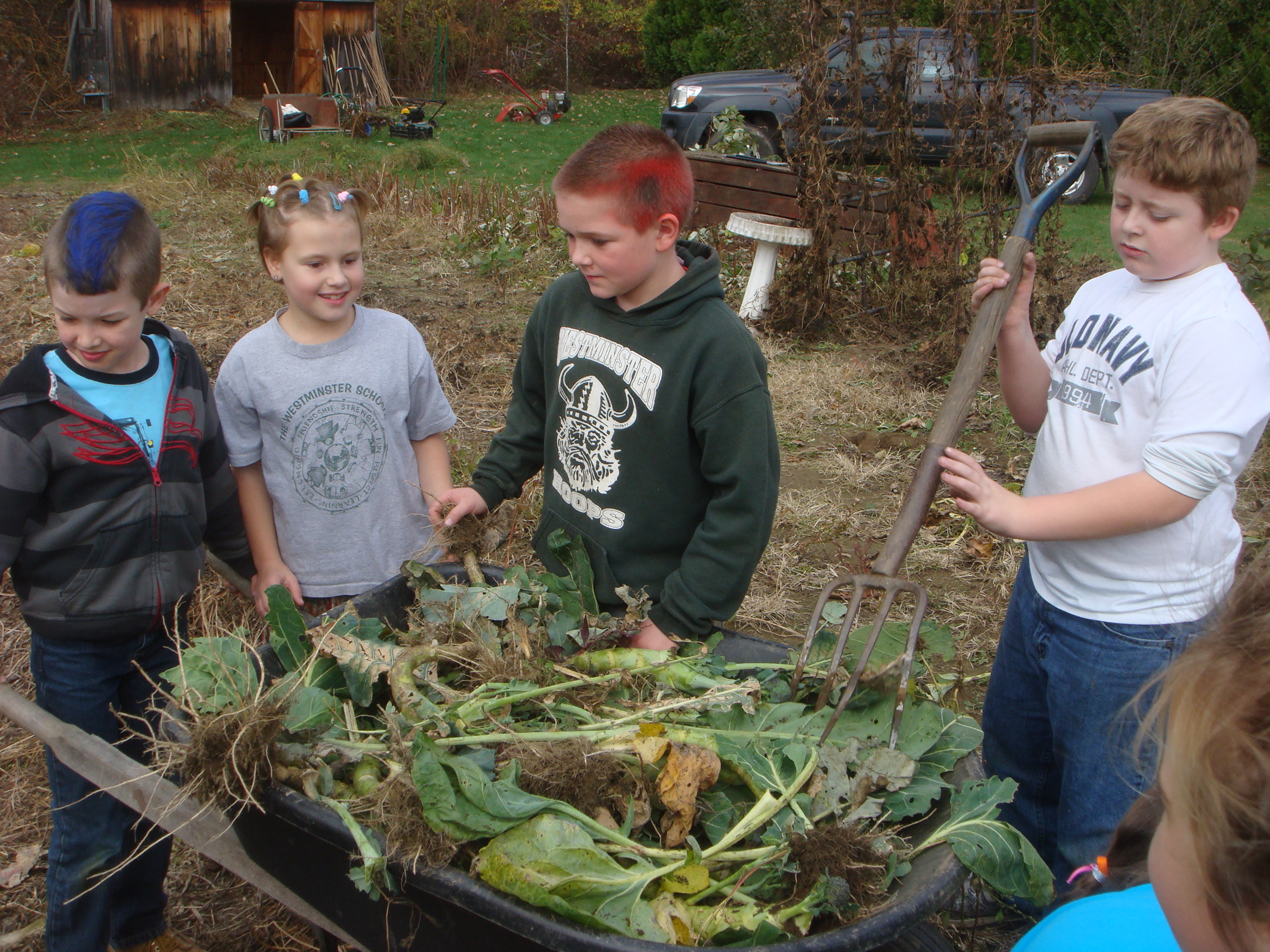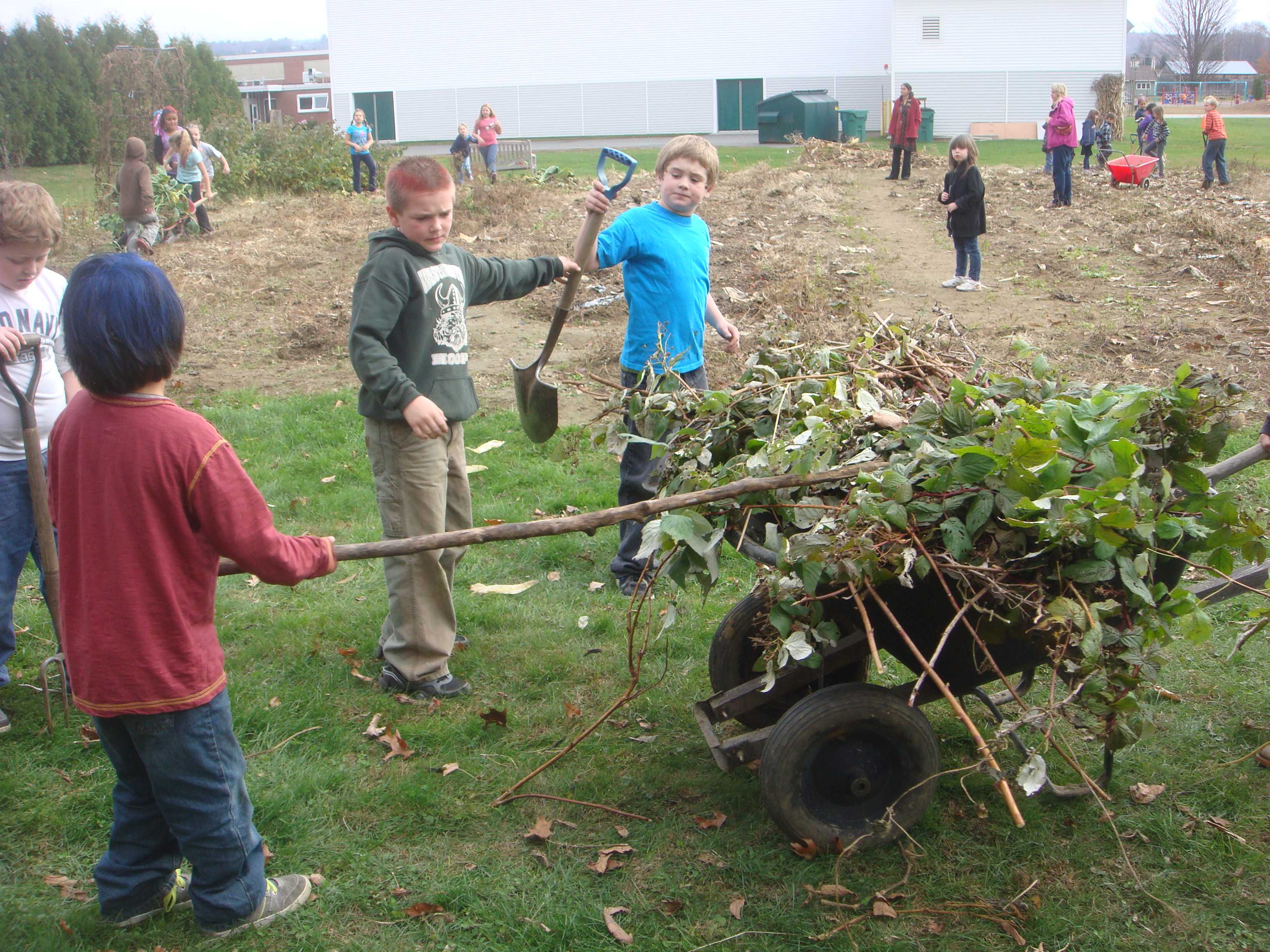 Students from Kindergarten to fifth grade participated in clearing dead vines and tough root systems. They piled wheelbarrows high with decaying matter for our compost pile. Third graders and Kindergartners worked and played together on this warm fall “Garden to Bed Day.”