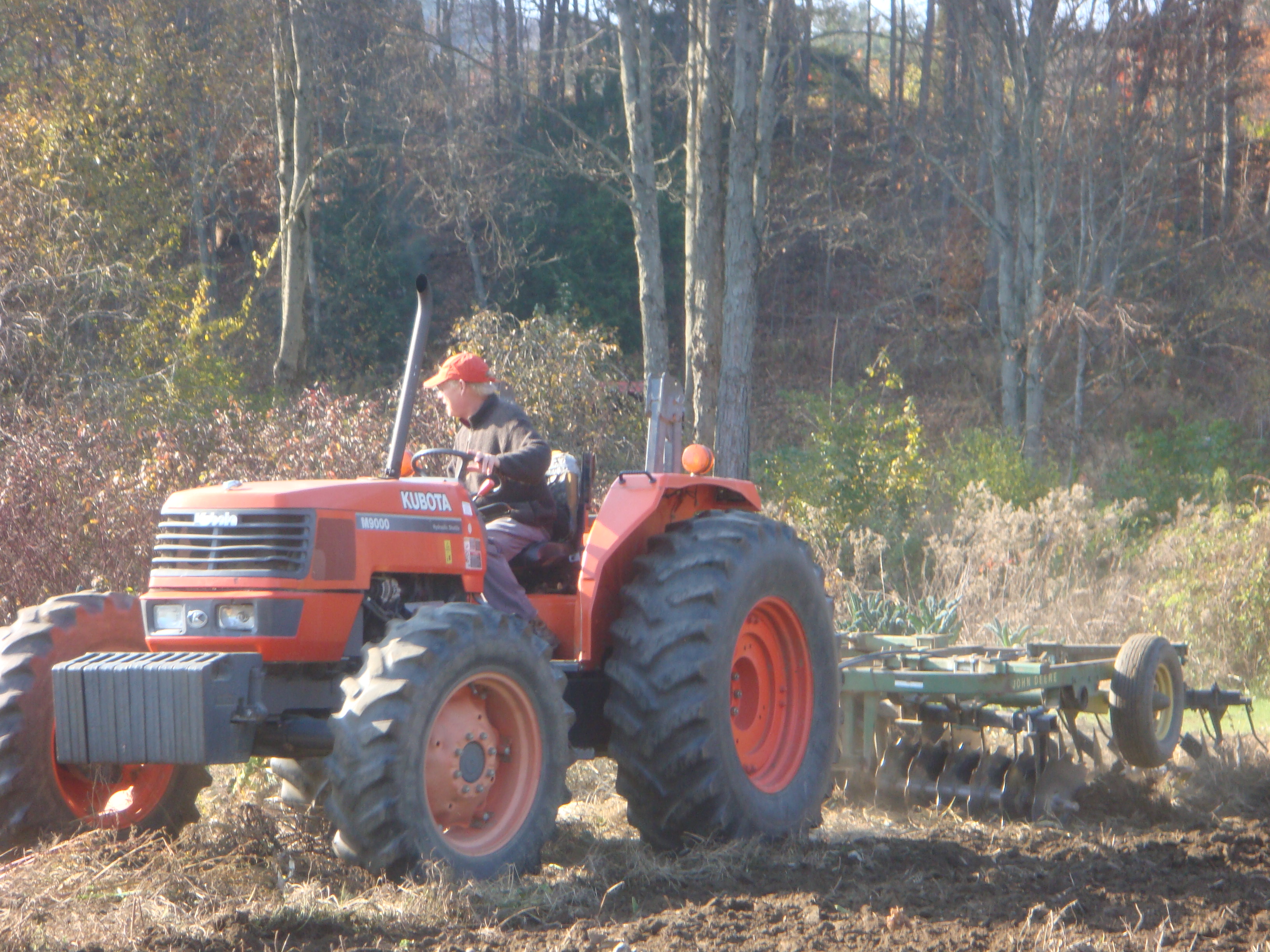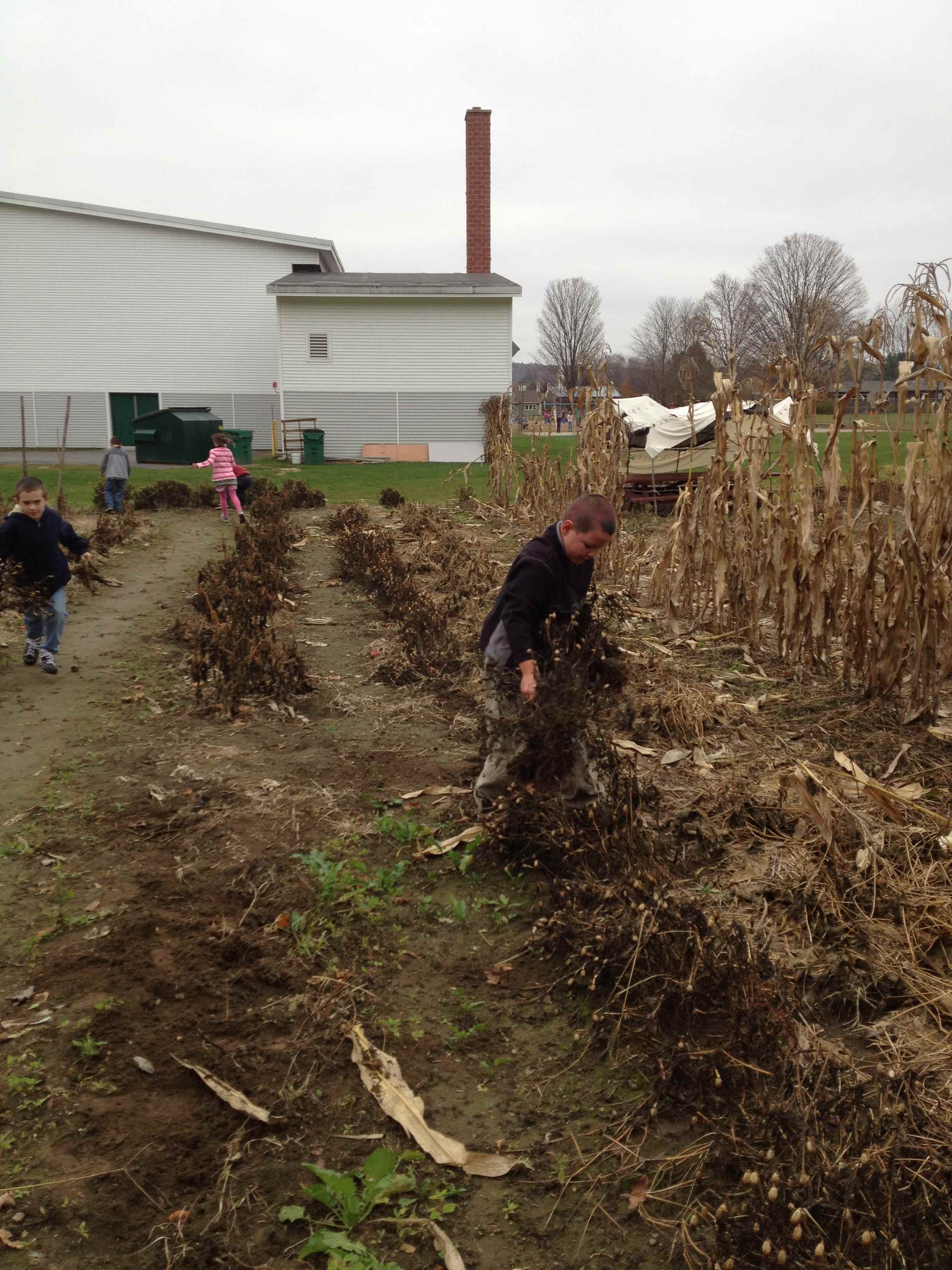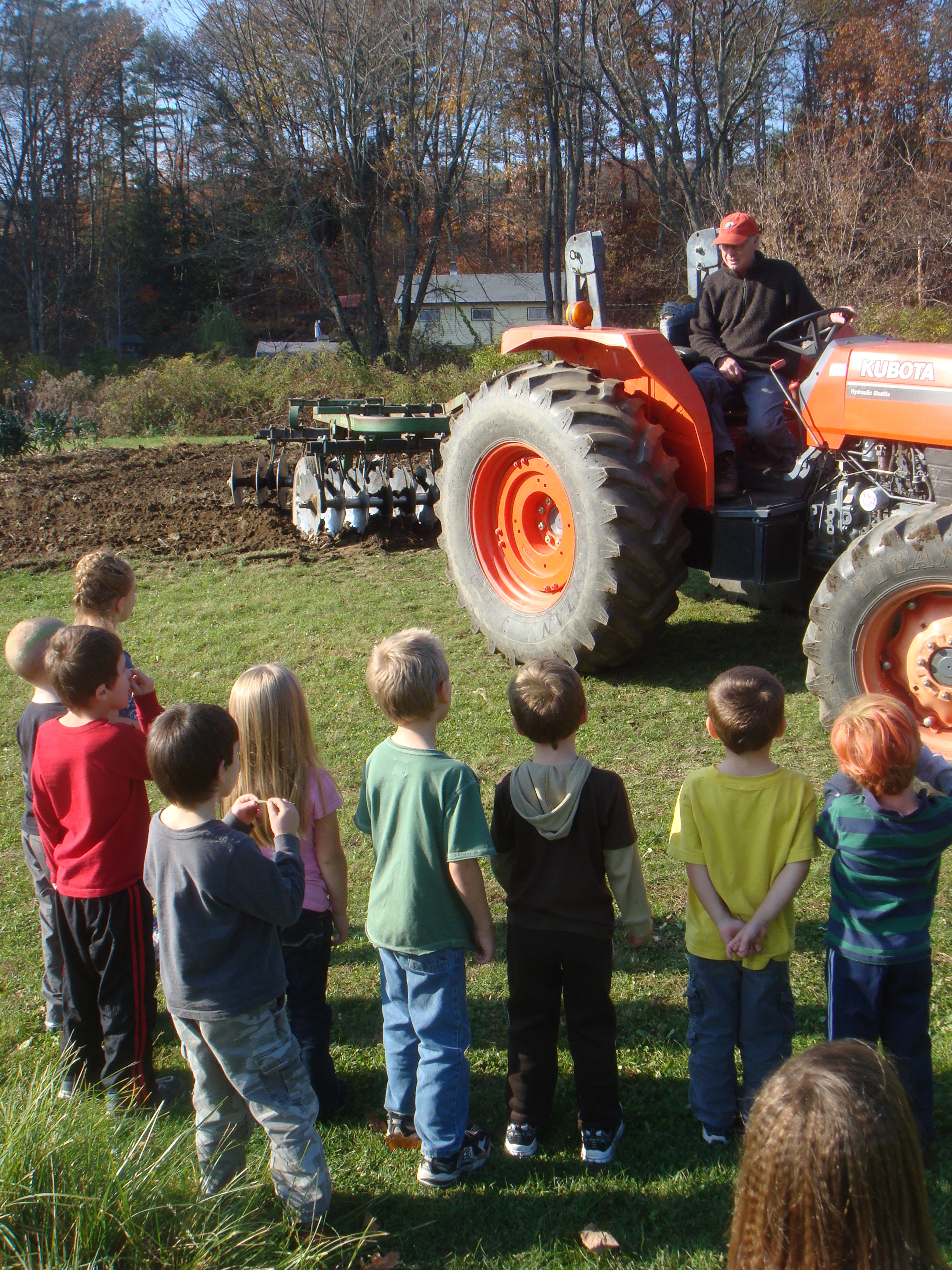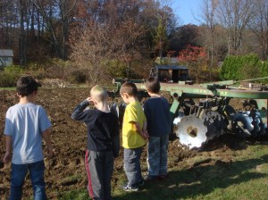 The great surprise at the end of their workday was the arrival of our local organic farmer Paul Harlow and his tractor tiller. The tiller is an impressive piece of machinery, especially if you’re 3 feet tall. One Kindergartner waxed poetic at the sight of the gleaming disks. “Hey, those look like the cymbals we play in Music class!” Another pointed to the letters on the side of the tractor and carefully spelled aloud the word, ” KUBOTA.” Paul kindly fielded questions from his rapt young audience. Watching the earth being turned over in preparation for winter is a time honored ritual in this town with its deep agricultural history.