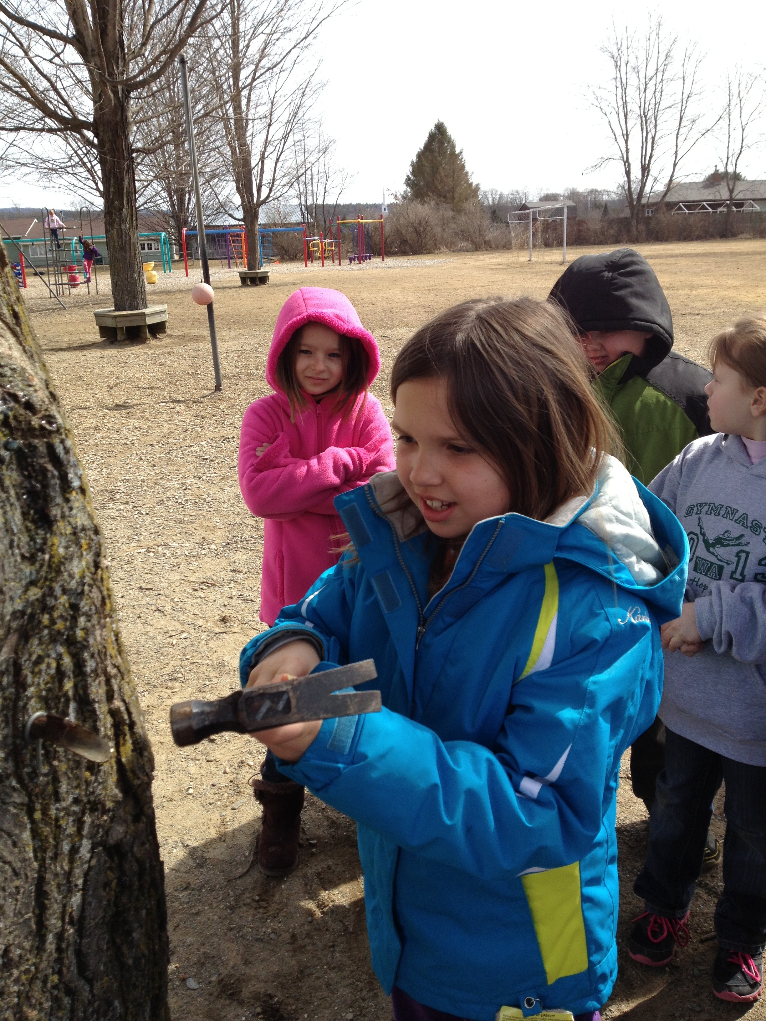 We drilled a 7/16 inch hole in the tree and we ‘set’ our taps by hammering a spout and a hook into the tree trunk. Sap came pouring out before we could even attach the bucket! The students put one bucket on the side of the tree that gets a lot of sun and one on the opposite side. They wanted to test out their theory that the sunny side of the tree would yield more sap. We’ve rigged up an outdoor boiler, with the assistance of our principal, Mr. Tullar. He brought in a deep fryer from home. The students will record the process of sugaring next week. (MORE SUGARING NEWS TO COME!)