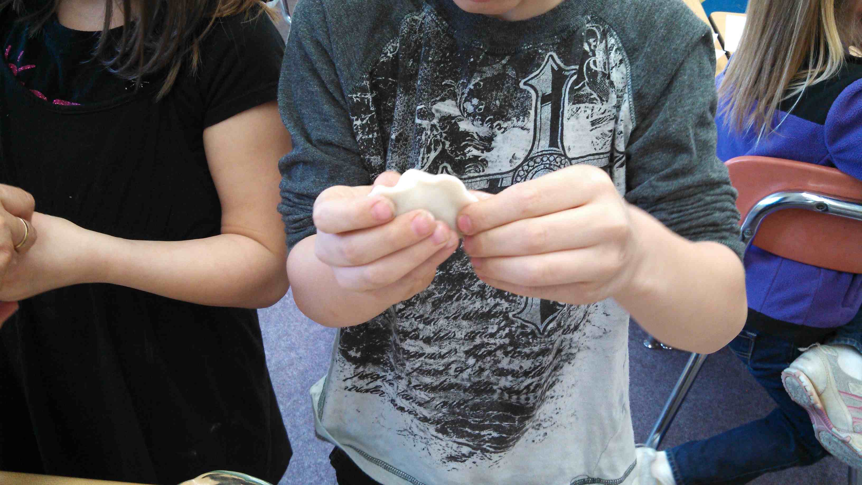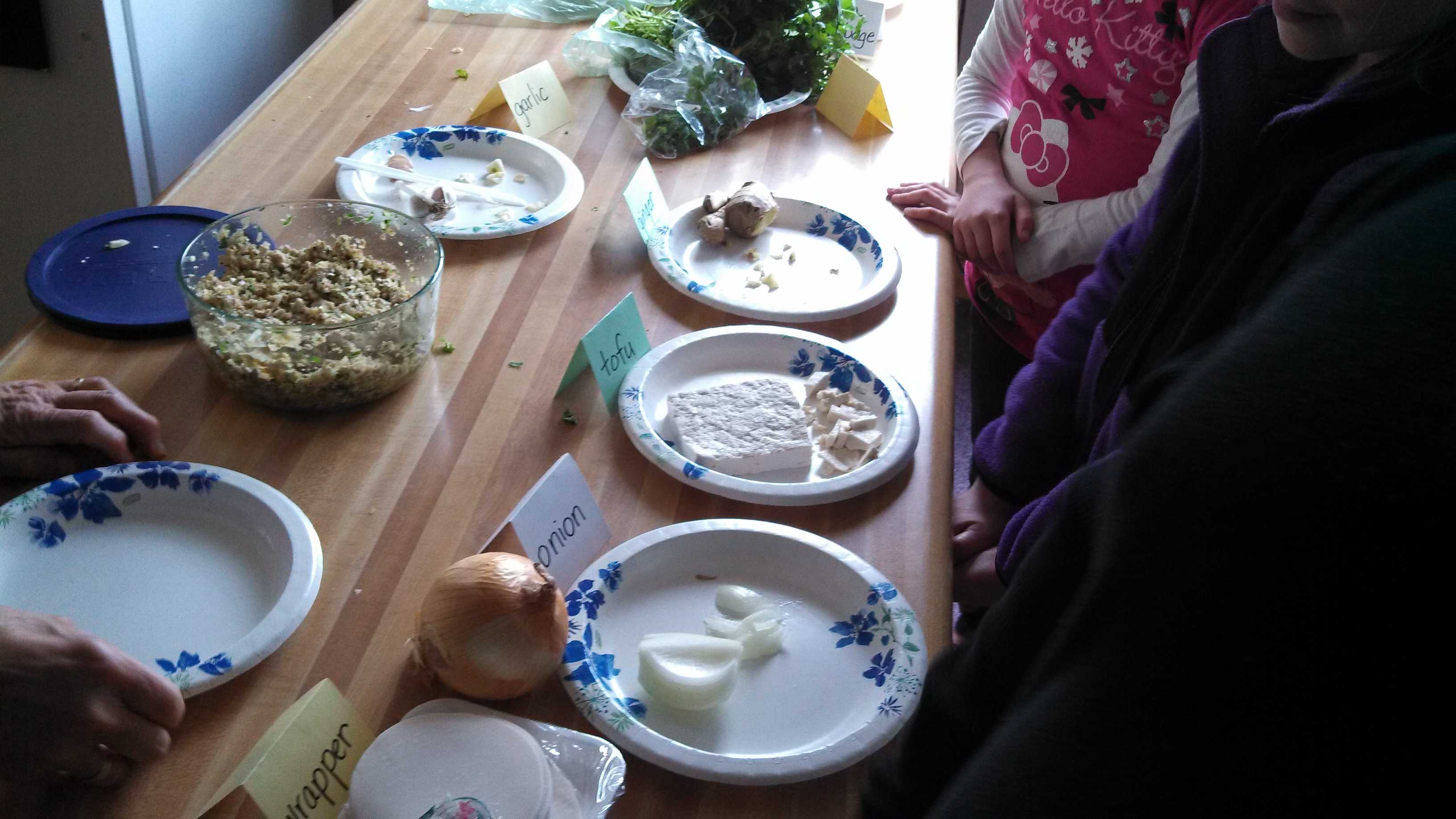 I called few at a time to the classroom kitchen to learn with me about how to make a favorite food served in Nepal: momos! These are steamed dumplings filled with vegetables and yak meat. Since we didn’t have a source for fresh yak, we substituted tofu. Steamed dumplings and accompanying dipping sauces are ubiquitous in Asian countries. I had learned from a Chinese visitor to my classroom years ago, how to press paper thin rounds of dough into moon shaped dumplings. She might have been skeptical about the skills of eight year olds. I was not, and the students rose to the occasion. You can find dumpling wrappers in most supermarkets. If you’re lucky enough to have an Asian market nearby, you’re sure to find a large variety of wrappers.