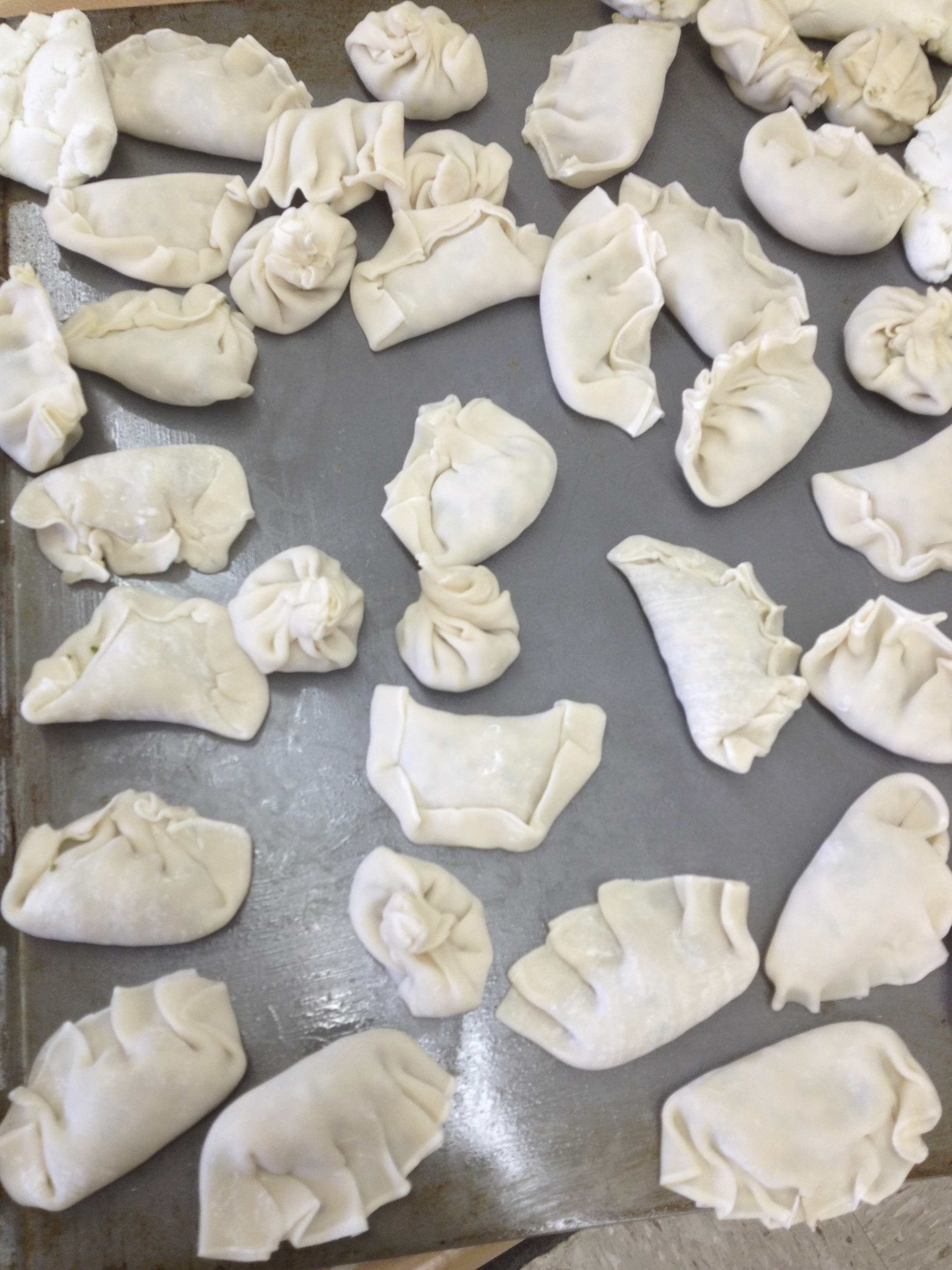 Each dumpling wrapper had to have its perimeter dabbed with water to allow the dumpling to hold together. Then, the outer edge of the filled half-moons were carefully crimped. Dumplings were placed on an oiled cookie sheet and covered with plastic wrap until we were ready to steam them.