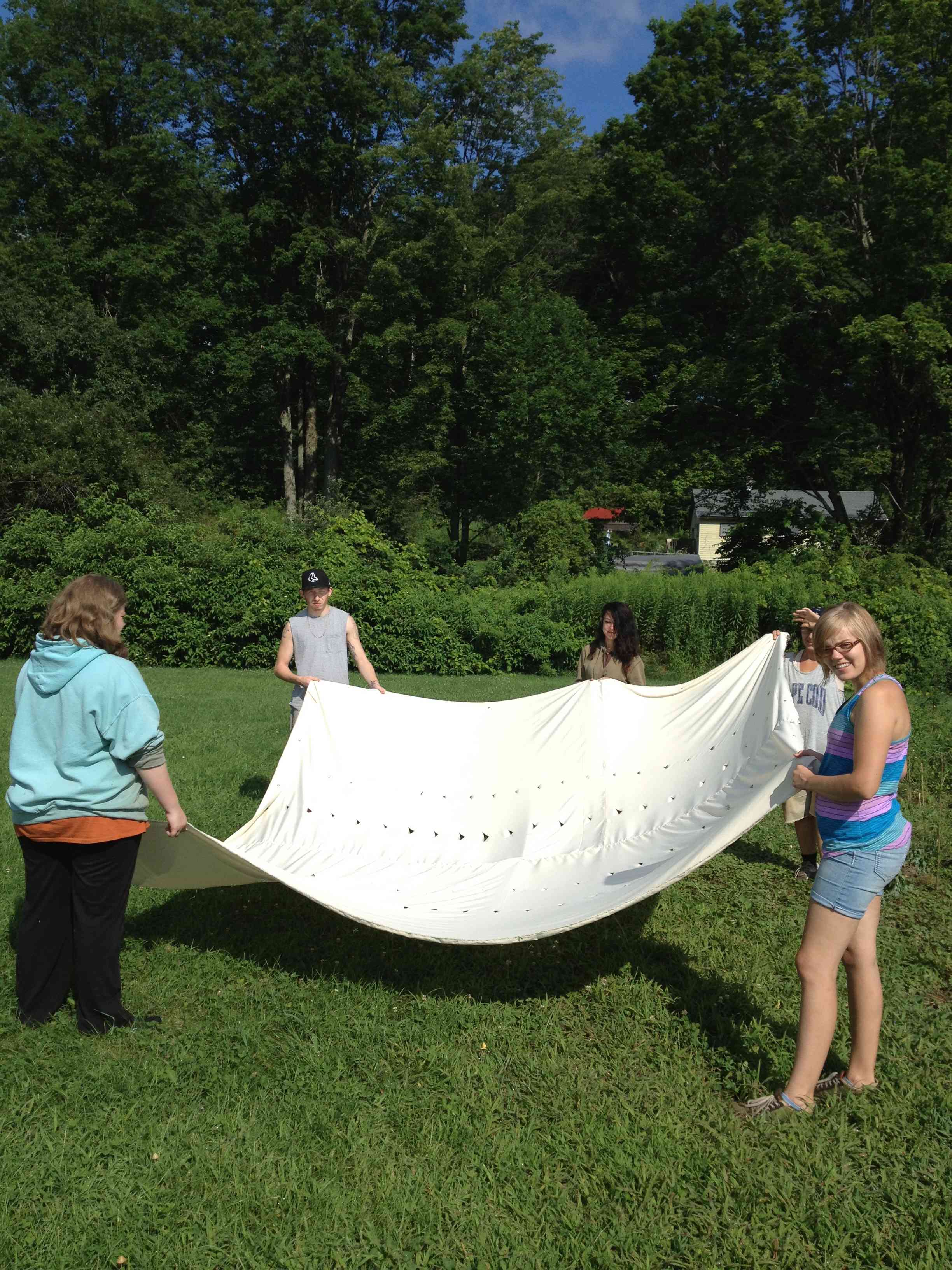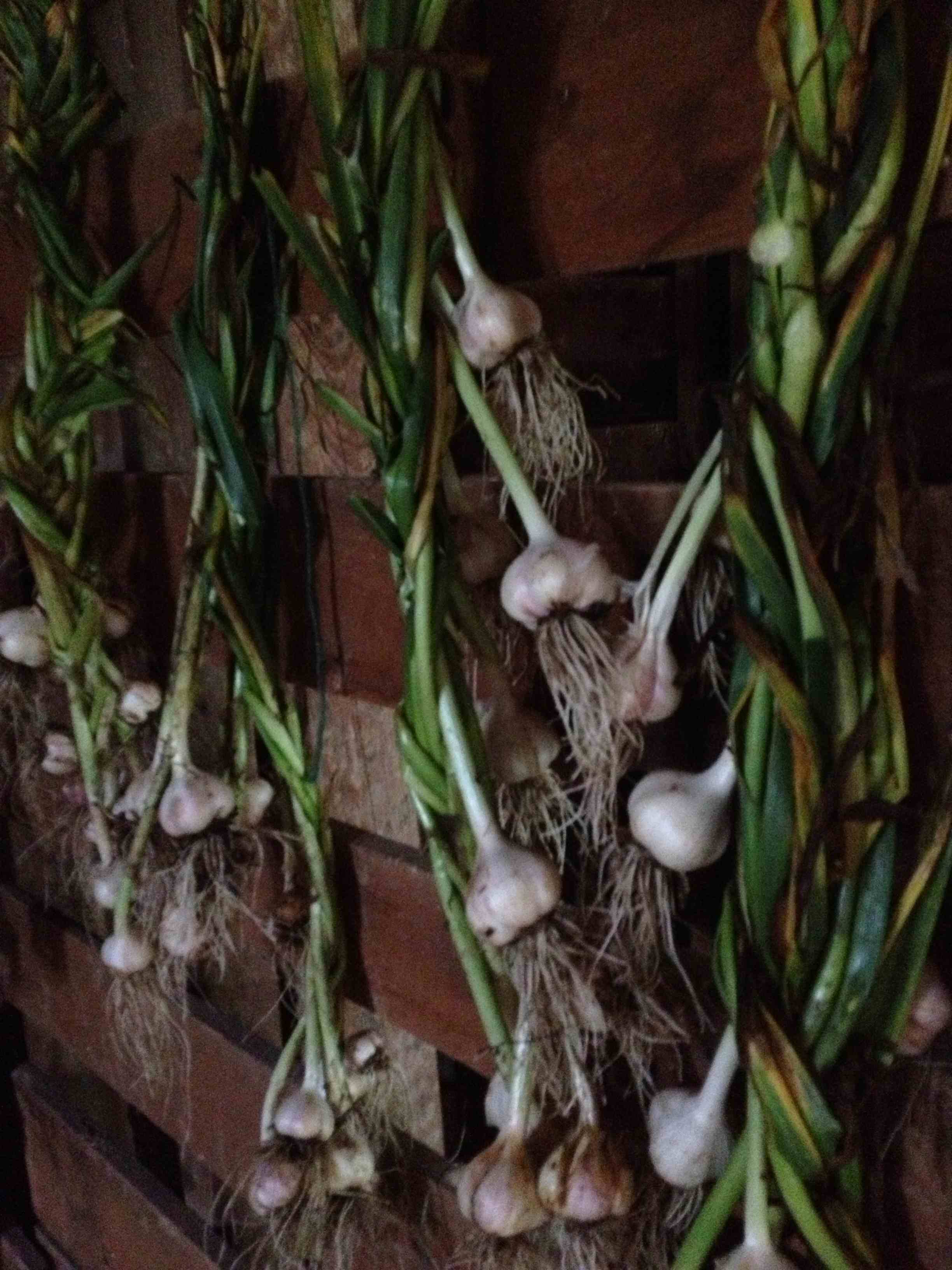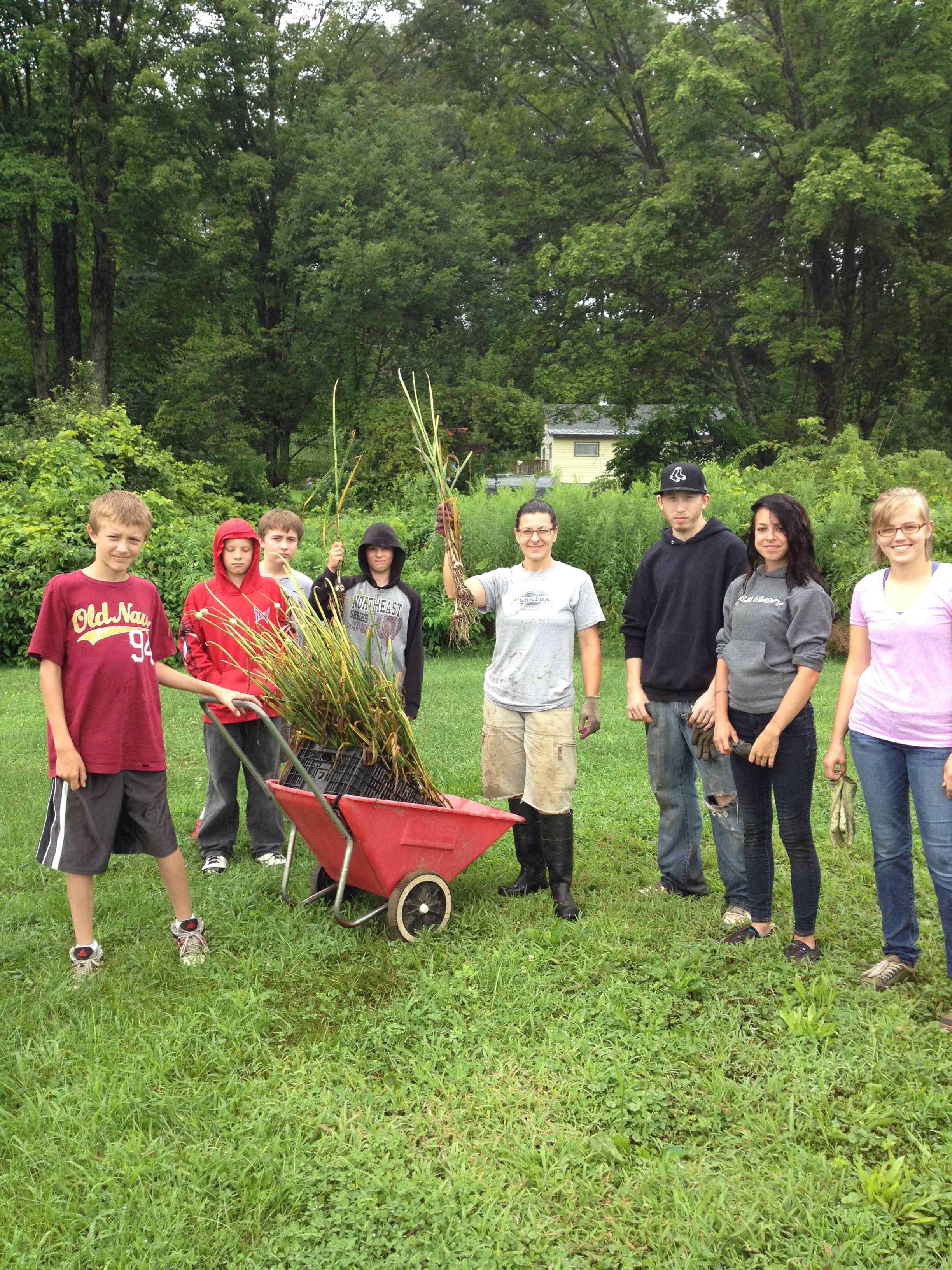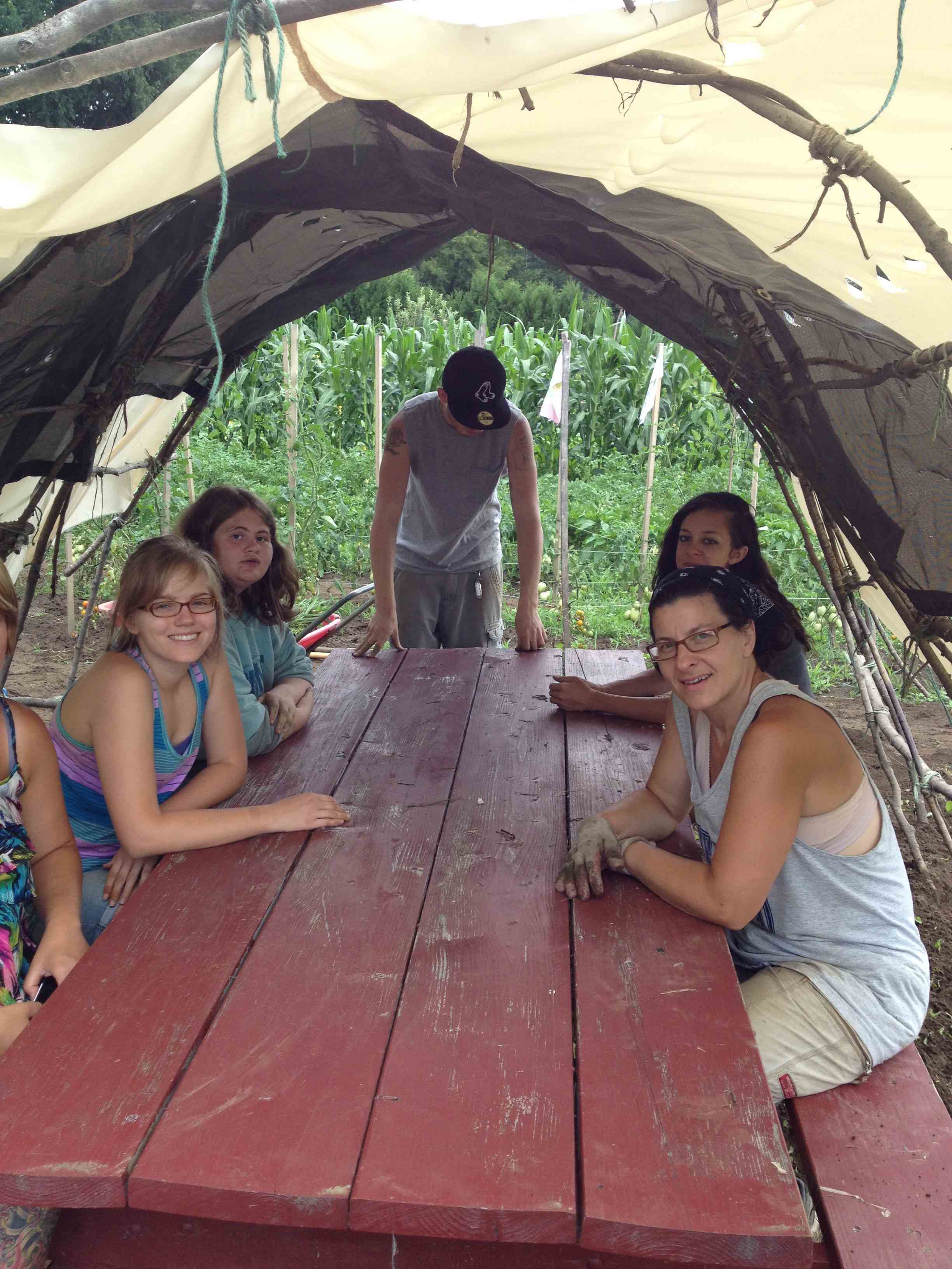 It’s almost August! Our hard working teen garden crew is only with us for another two weeks. The summer campers leave that week as well….just as our garden is beginning to yield its bounty. We harvested the garlic planted last fall (see Nov., 2012 entry) and it’s been hung to dry in a neighbor’s barn. Garlic likes a well ventilated dry place to cure. We finished the shade tent by stretching material over the frame. Weeding has been a demanding chore for these teens and their crew leader. We’re hoping to mulch with straw to keep the weeds down until school begins at the end of next month.
