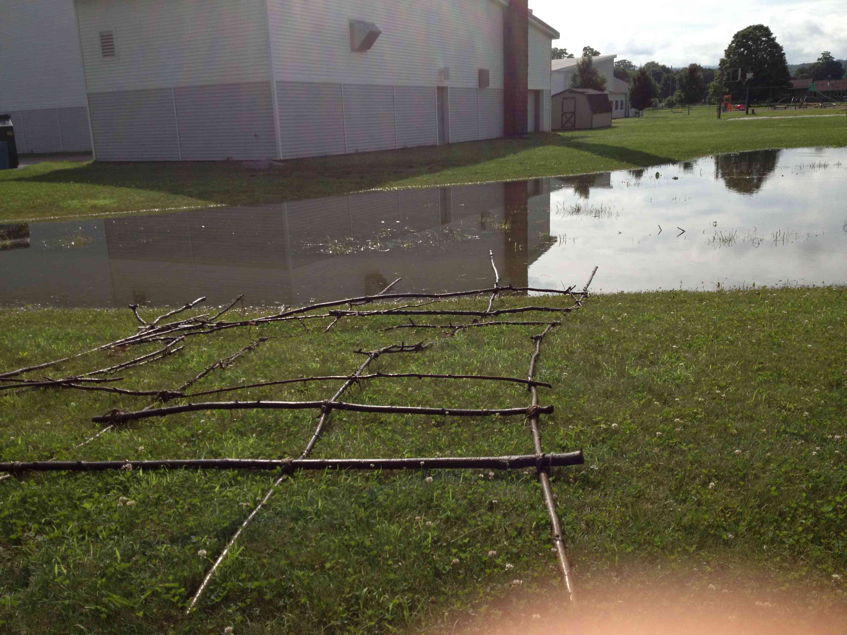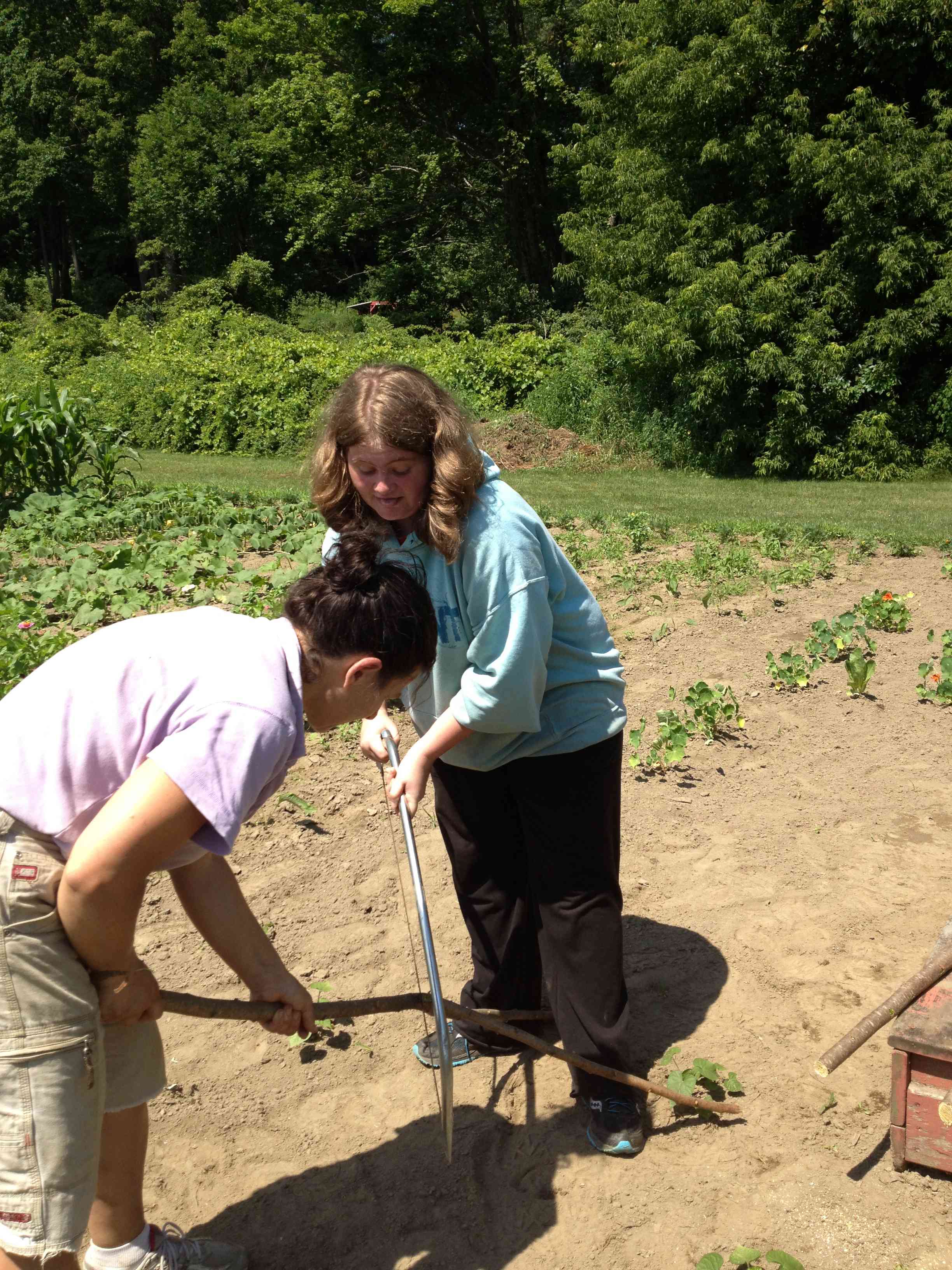 Last week I came out to meet with the new garden crew, as well as moms, Stacie Illingworth and Amy Rice and their children Our goal was to put the sapling shade house back into the garden. We’d had to move it for tilling last spring. We pulled it out of the ‘lake’ that had formed in the school field after all the rain this month. Lots of the old saplings needed support or replacement. The crew went to work cutting new saplings. We definitely needed everyone to get our frame up again. What great teamwork! New holes were dug and everyone weighed in on how to brace the stakes. Afterward, Amy rode her horse over to school to check up on the frame. It’s still up and holding. Now I need to sew a tarp to cover the frame. This year we also planted some scarlet runner beans that we hope will vine up the poles to help shade the children.