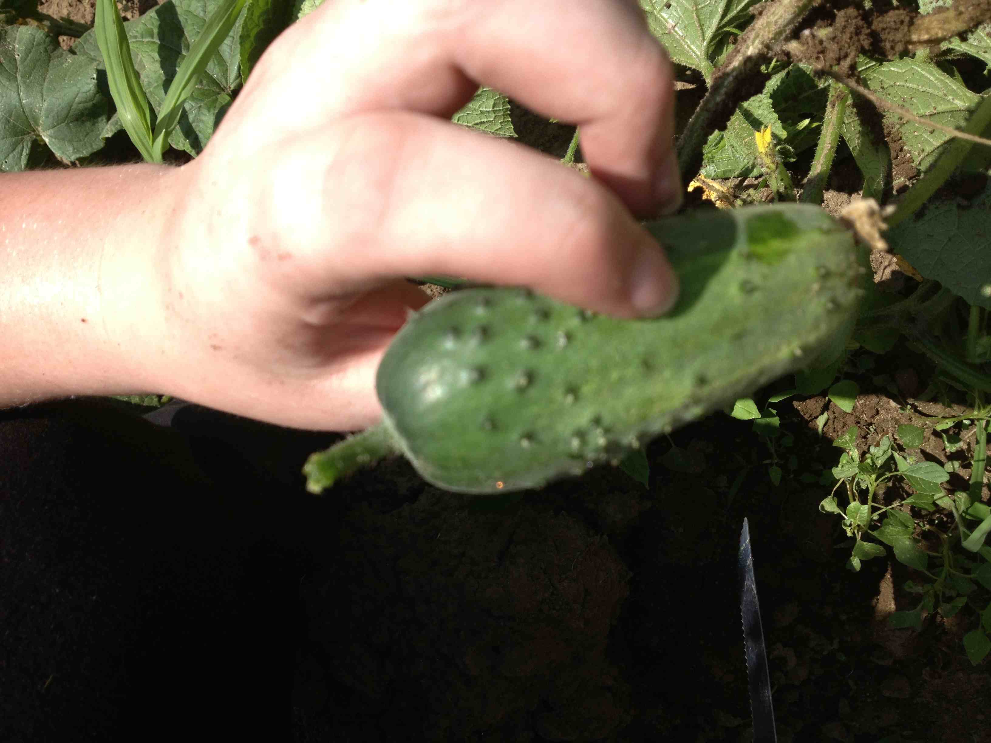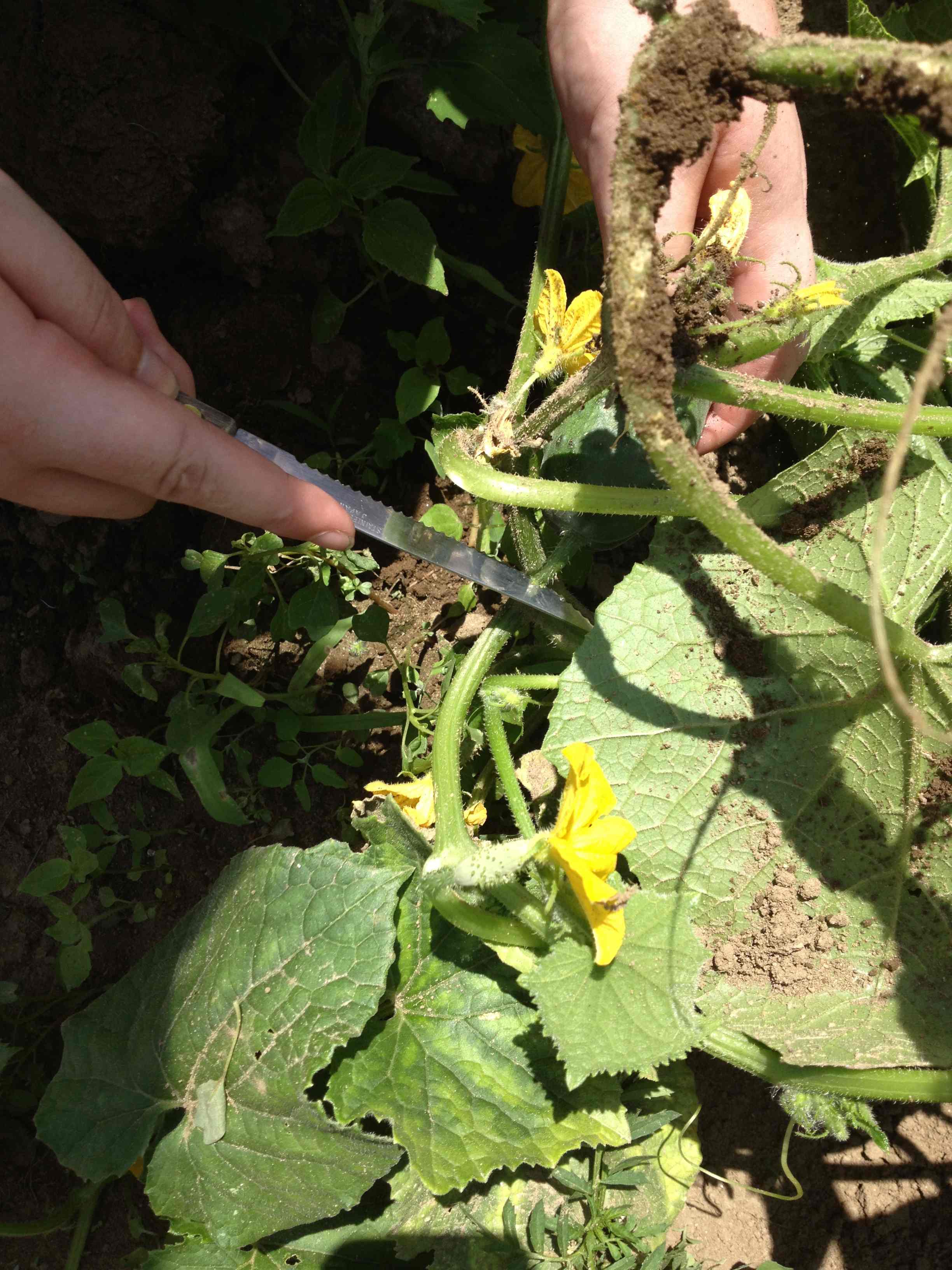 It’s easier to spot cucumbers when they’re vining up a trellis. We experimented with two different kinds of support this summer. Teen crew members love sawing and lashing structures together. Even our older gardeners needed guidance to discover the tiny cucumbers growing behind yellow blossoms. It’s a thrill each time I see the spark of recognition light up their faces!