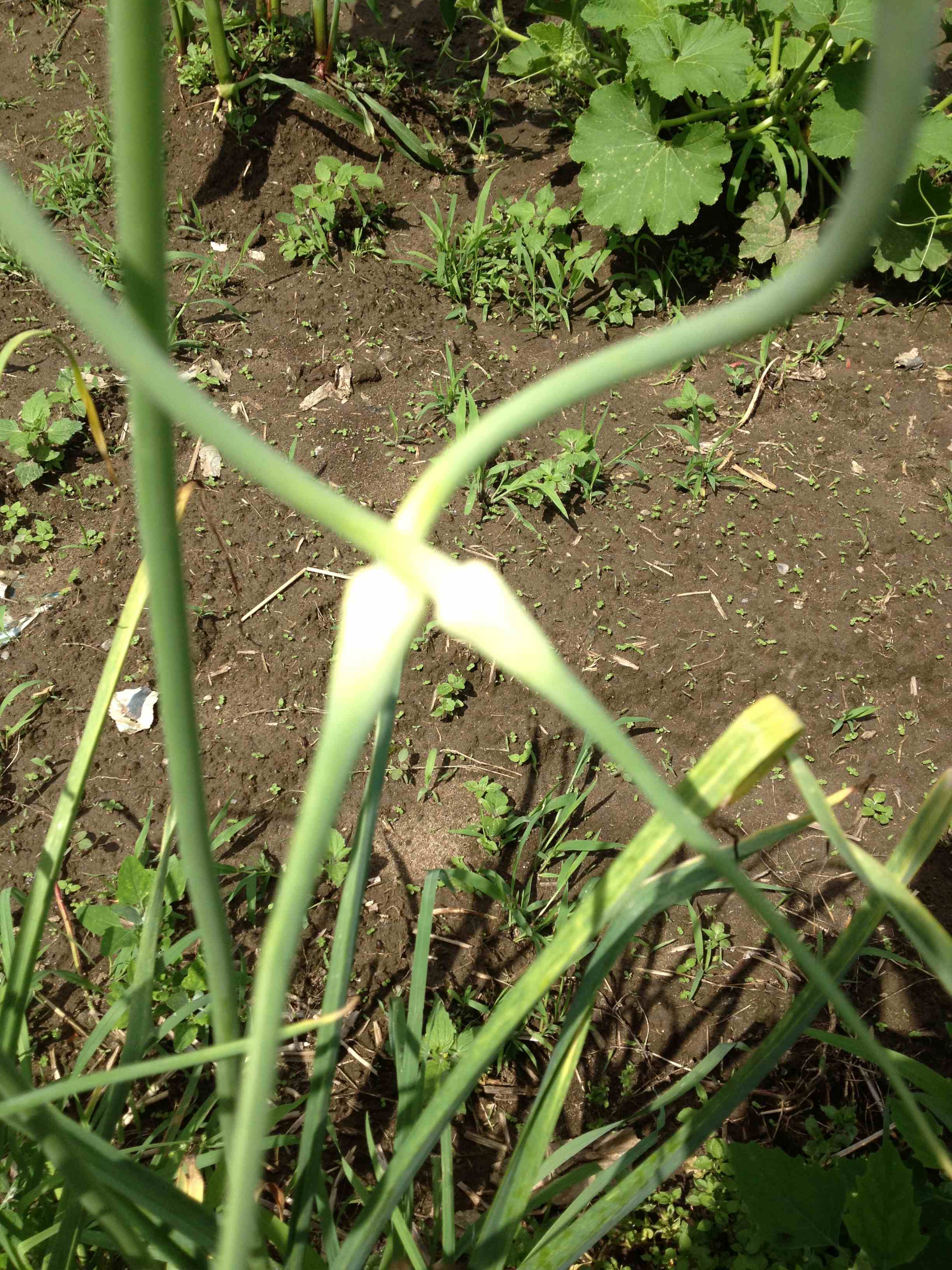 A row of basil, started from seed by students in the After School Program was also transplanted into the garden. At this point, three weeks later, I am already pinching back the top two leaves of the basil plants to allow the plant to branch out. Garlic plants from last fall have sent out their flower buds (scapes). These can be cut back as well and put into a blender with olive oil and salt to make a very spicy pesto. In the fall we’ll make basil pesto with our own garlic. Pesto can be frozen to use on pizza or with pasta. Throughout the winter we’ll be able to taste memories of our garden.