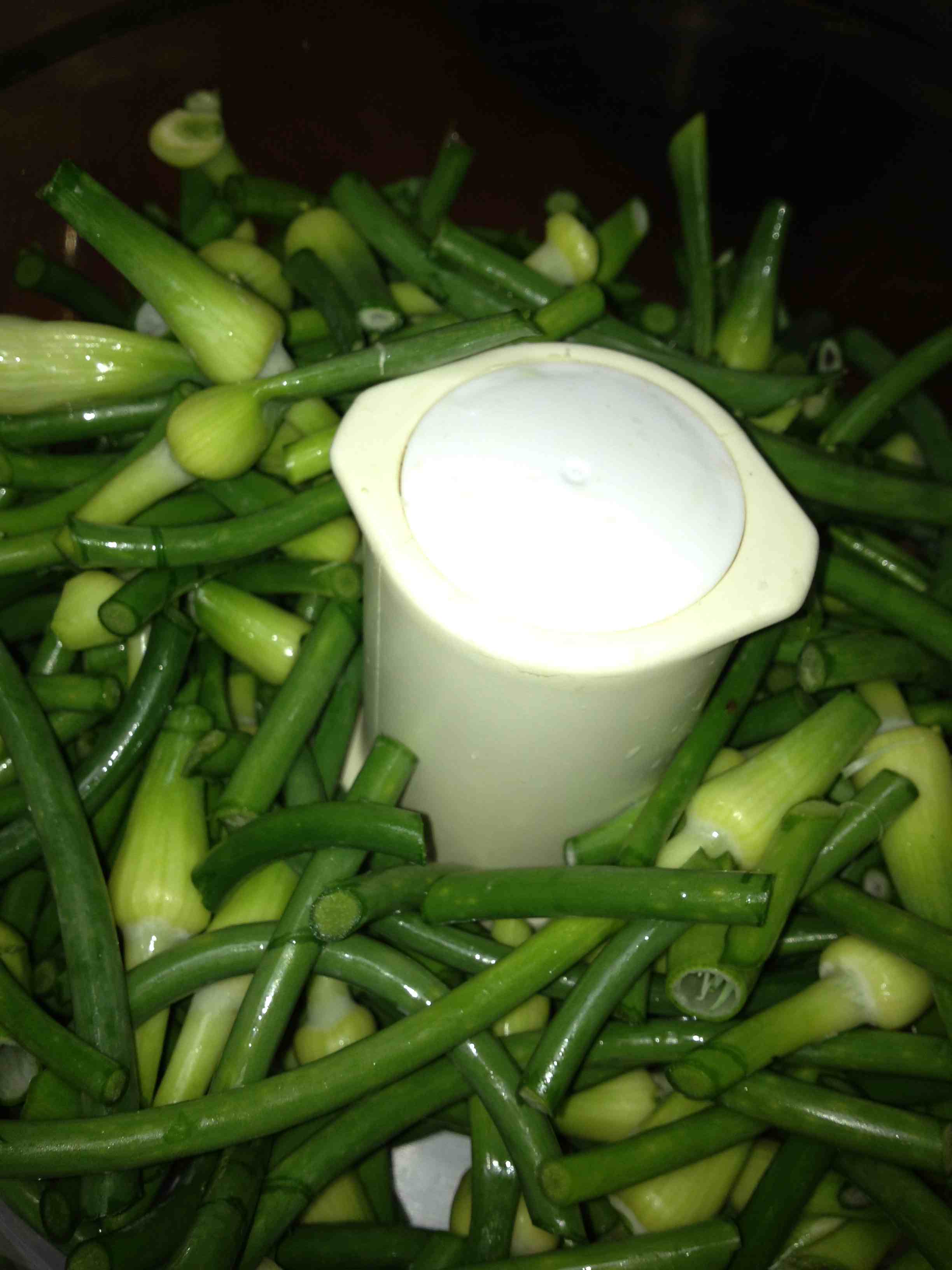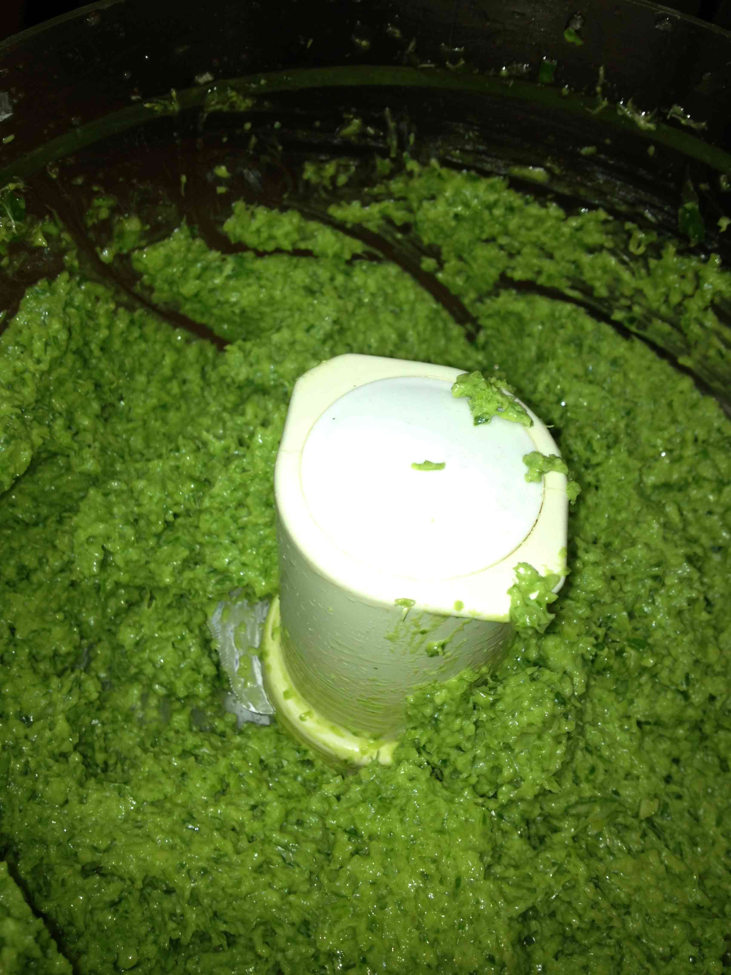 A pesto made from the flowers of our garlic plants (see previous posts) is the earliest and easiest to make. The very tips are cut off if they’re too dry. The rest, stalk and all goes into the food processor with olive oil and salt to taste. (Check consistency as you pulse. You should have a nice spreadable paste.) This pesto can be used in pasta, as a seasoning, or simply spread on toast with your favorite sandwich ingredients. YUM. Why didn’t I add lettuce???