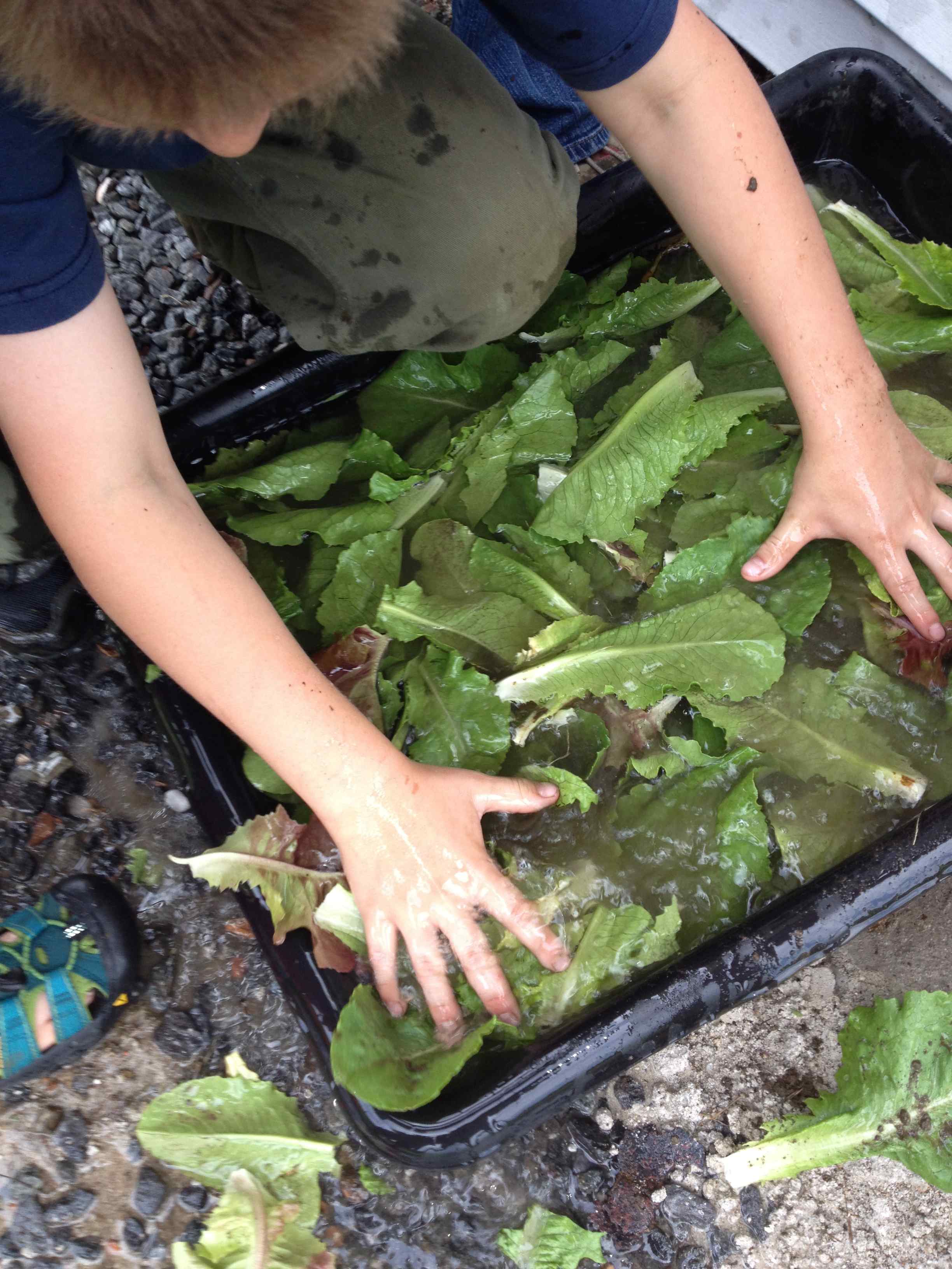 The third grade lettuce investigators came out to the garden to harvest their early crop just as school was ending. Some had happily been recording changes in plant growth for four weeks. Others lost their adopted lettuce plants during the experiment and theorized about what had happened. Everyone joined in to harvest, wash and spin the lettuce dry. We have a giant lettuce spinner. It stopped working mid spin, but one of the class members is a great mechanics “trouble shooter.” This provided a nice opportunity to highlight an individual student’s strength. He had the spinner gears humming in no time.