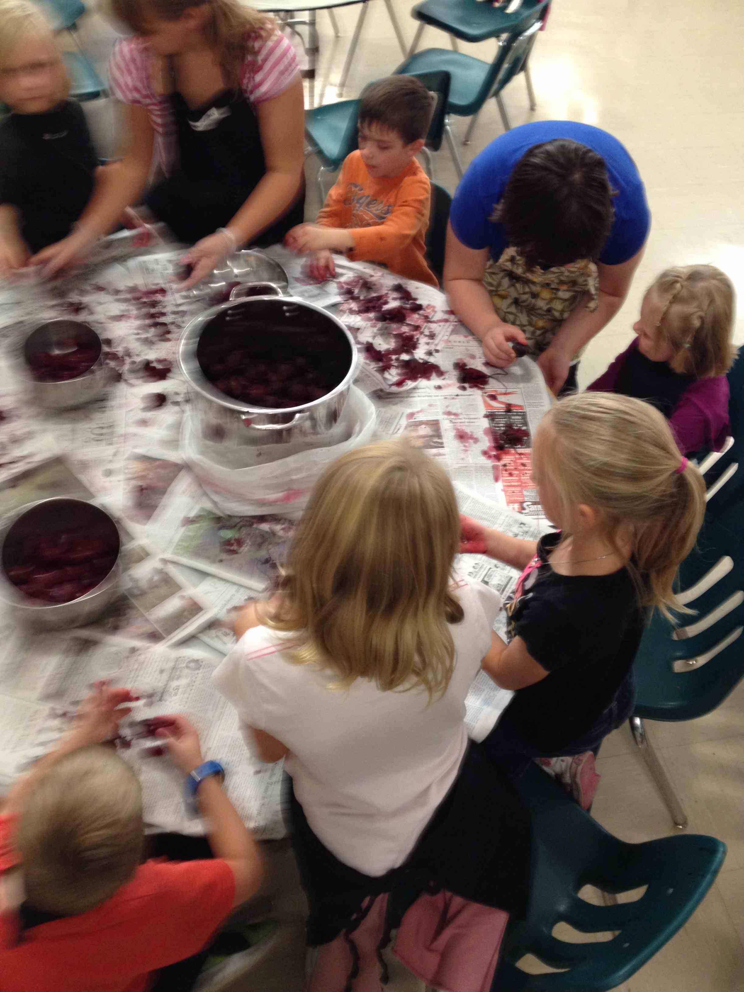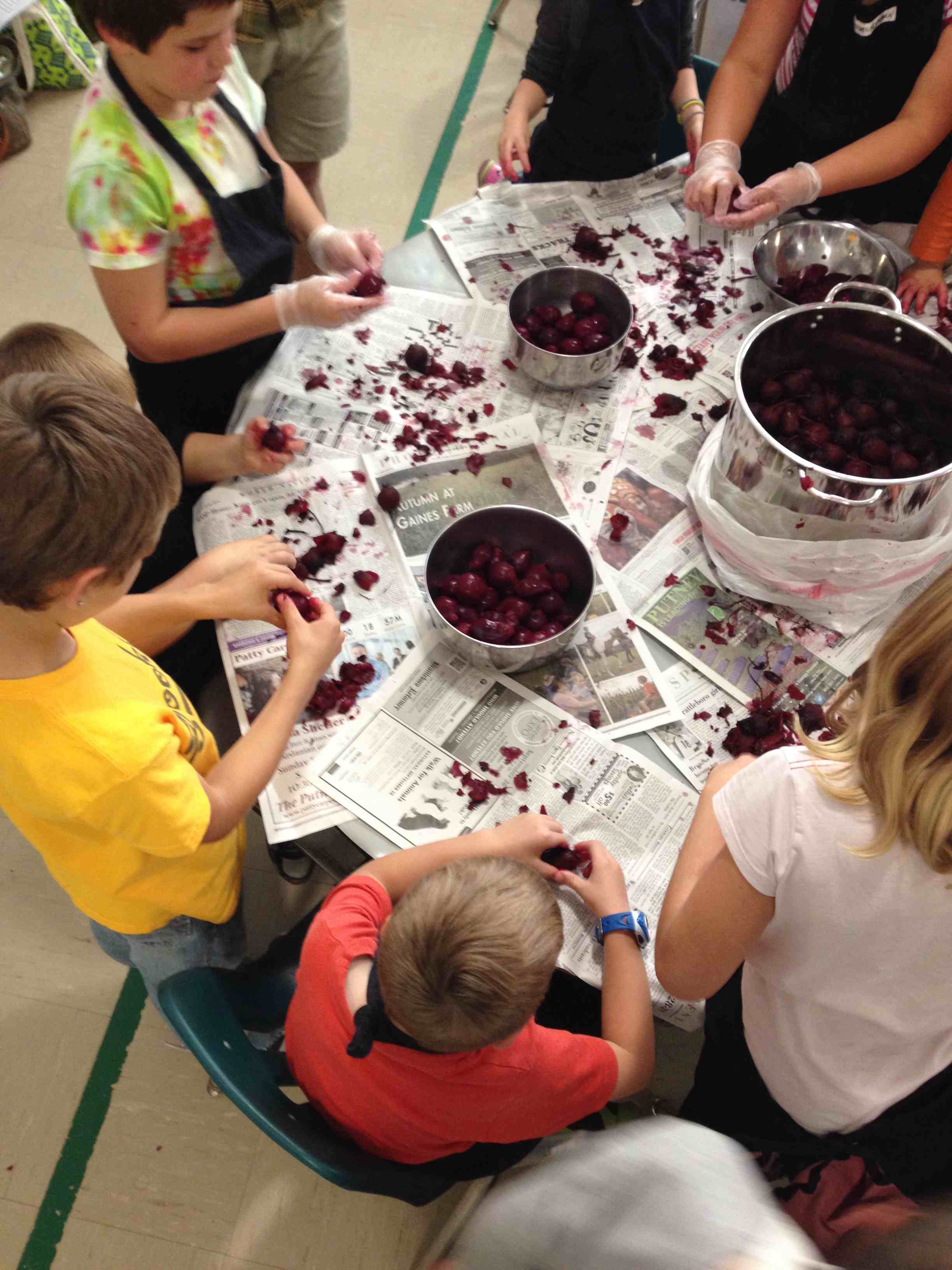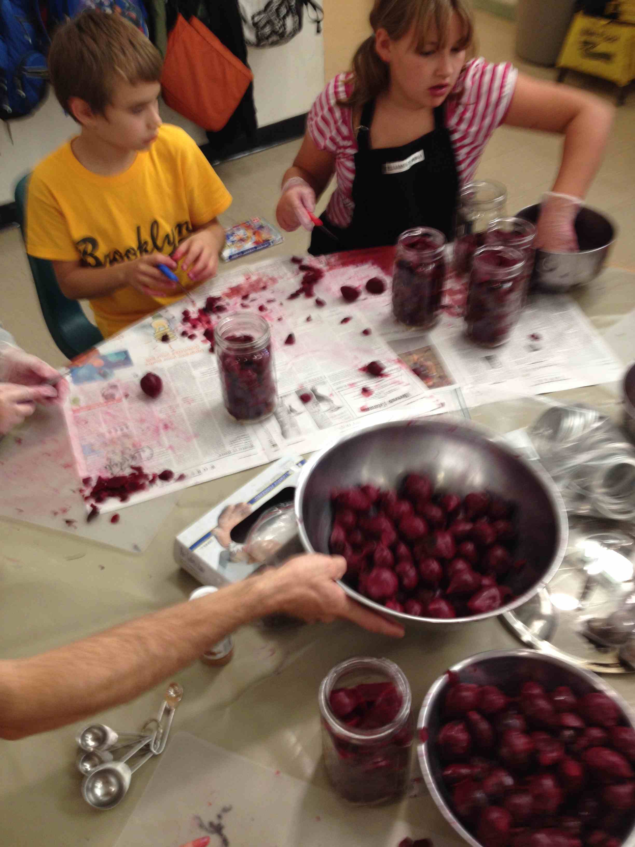 boiled and cool, so it was very easy for even the youngest children to pop off the peels. After the bowls were filled, older students were the ‘quality control’ managers, making sure all skins were removed. I had brine boiling to ladle into sterile filled jars. I overheard a few great conversations among students as the red beet juice colored their fingers: