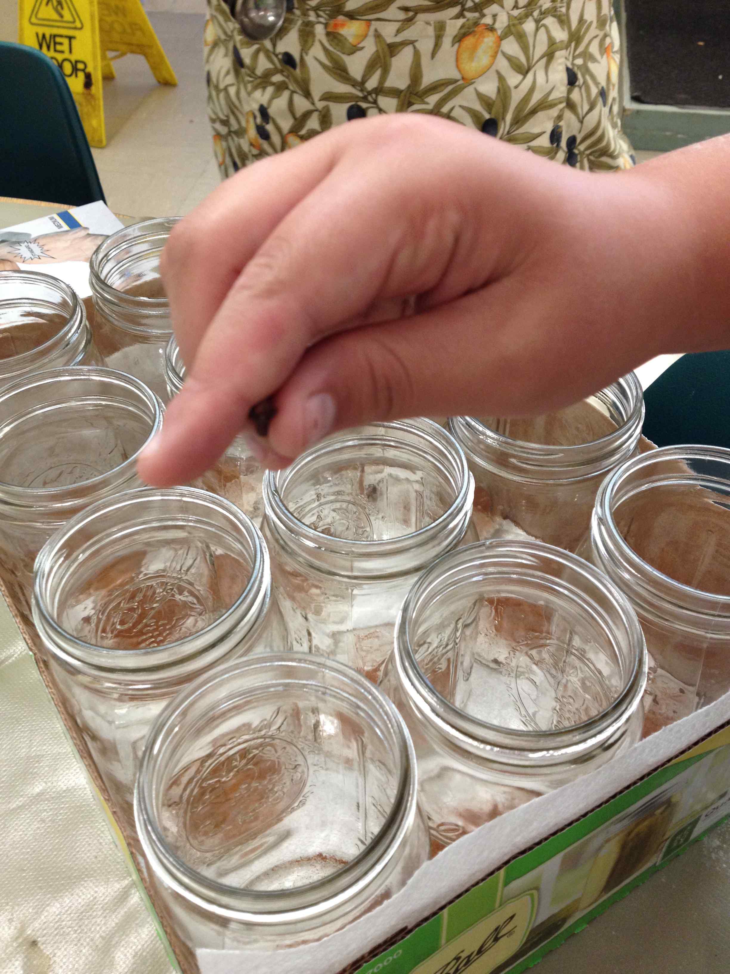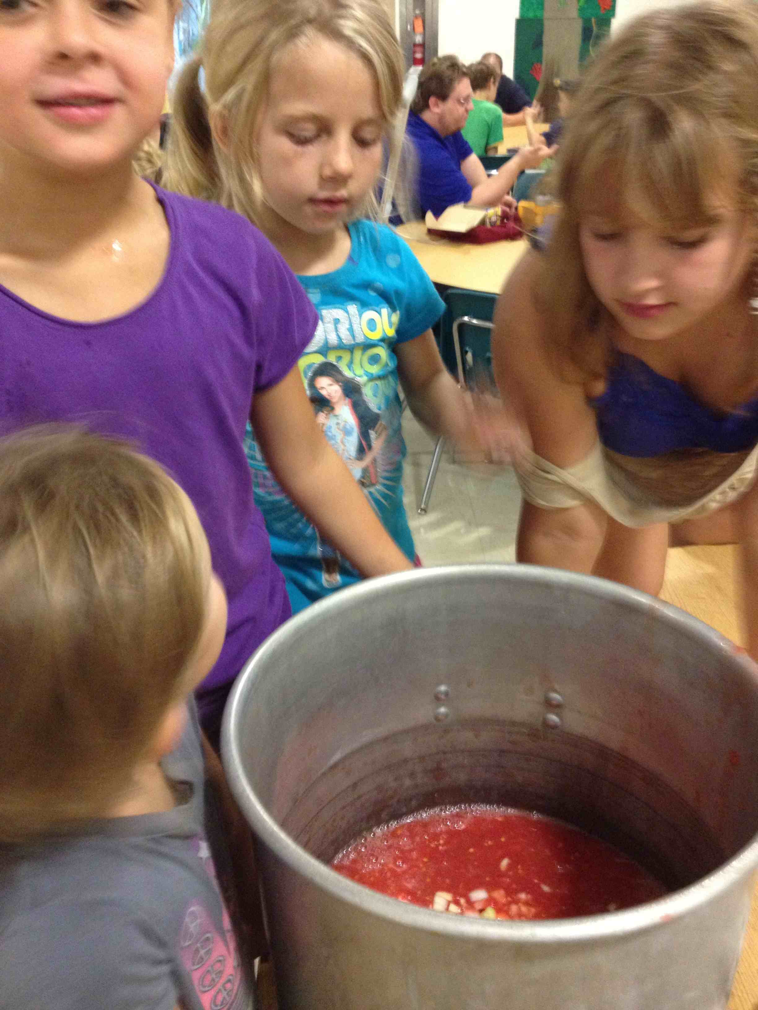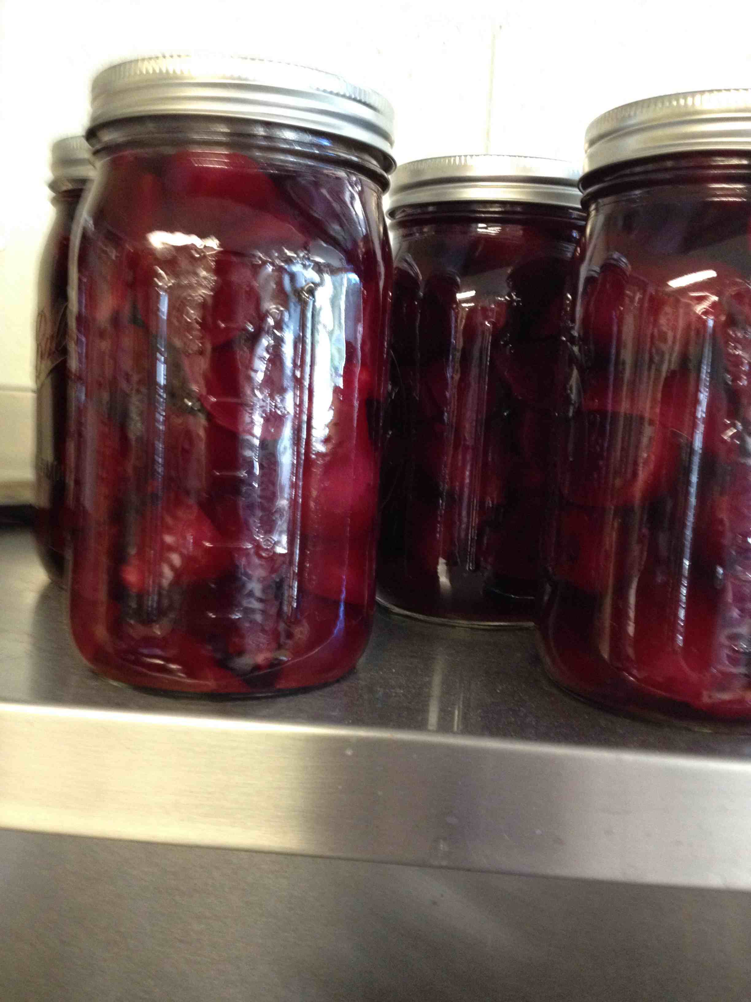 boiled and cool, so it was very easy for even the youngest children to pop off the peels. After the bowls were filled, older students were the ‘quality control’ managers, making sure all skins were removed. I had brine boiling to ladle into sterile filled jars. I overheard a few great conversations among students as the red beet juice colored their fingers: