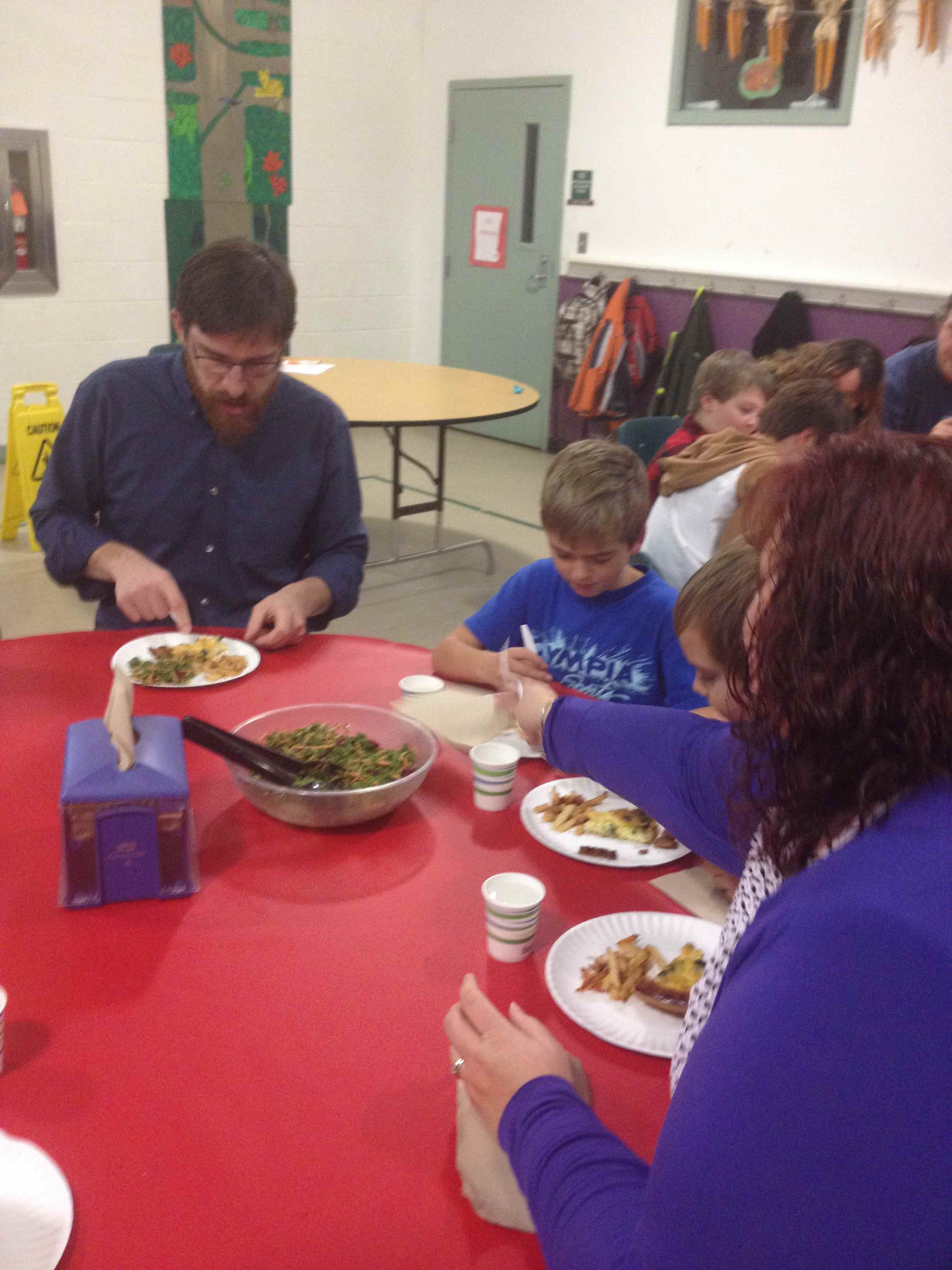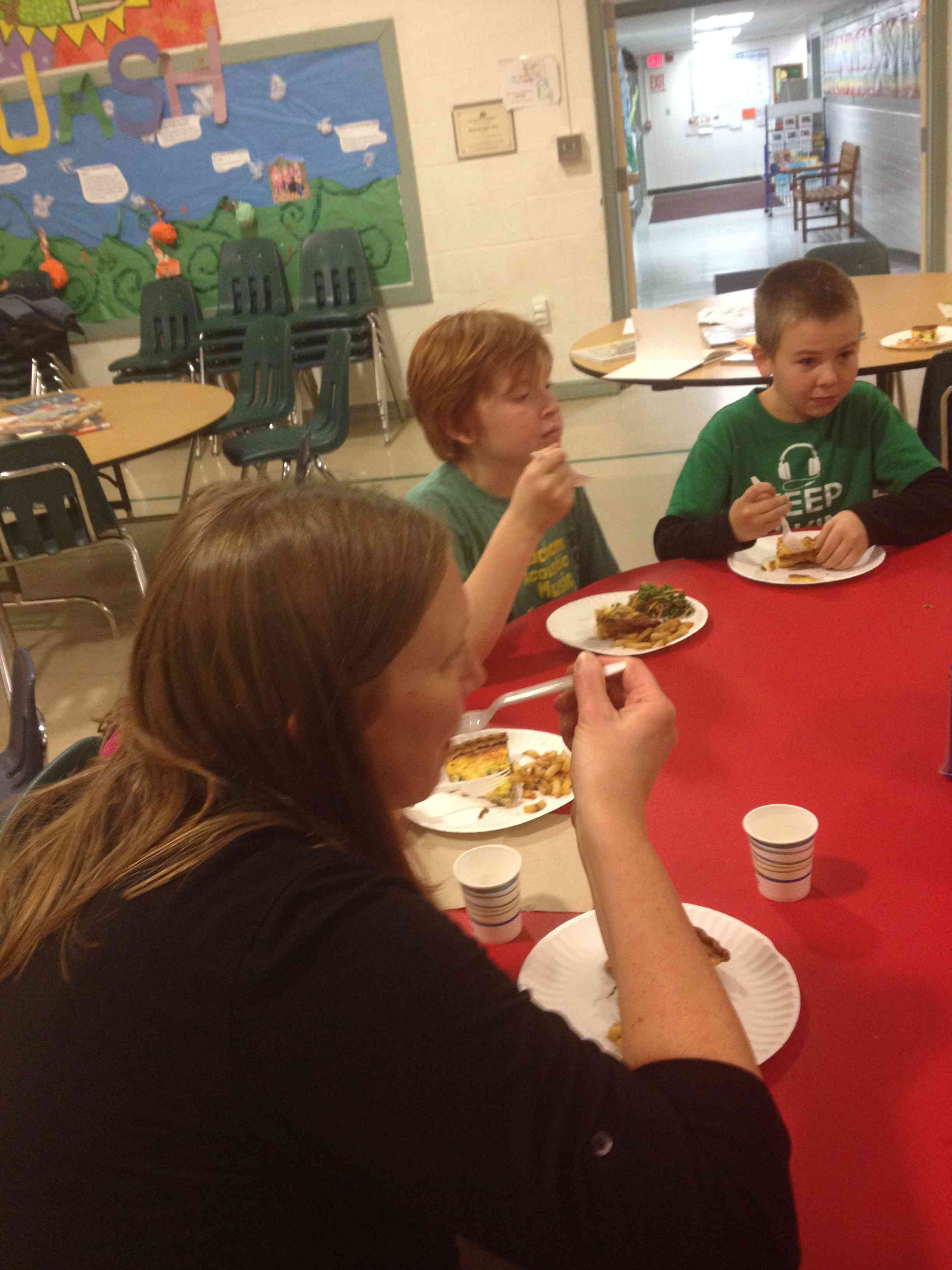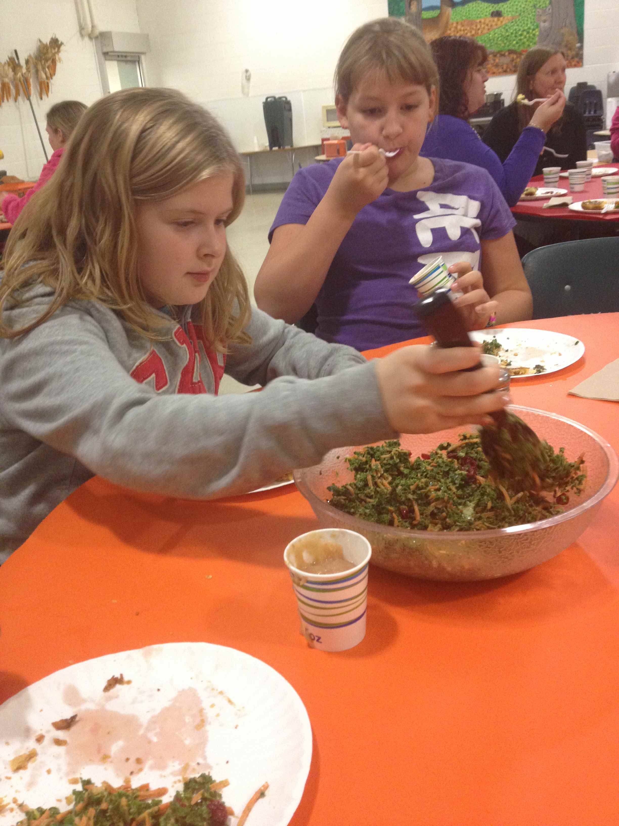 This November we also hosted an After School Program dinner for parents and children. Forty family members enjoyed vegetable quiche and kale slaw, followed by applesauce for dessert. The applesauce was made by the children in the After School Program. Apples were donated by Russell Allen of Connecticut Valley Orchards. While students made dessert, their parents participated in a discussion on techniques for getting reluctant eaters to try new foods. Everyone had a great family strategy or story to contribute. We all came away with a few new ideas for getting children to make healthy food choices. Some ideas: Each child is different in temperament, affecting his or her willingness to take risks. Be patient, but be persistent. Sometimes it take four to sixteen attempts before a child is ready to accept a new food. Some children have sensory issues and don’t for instance enjoy any foods that seem lumpy or crunchy. Often if a child participates in the creation of the dish, it is more likely that s/he will eat it.