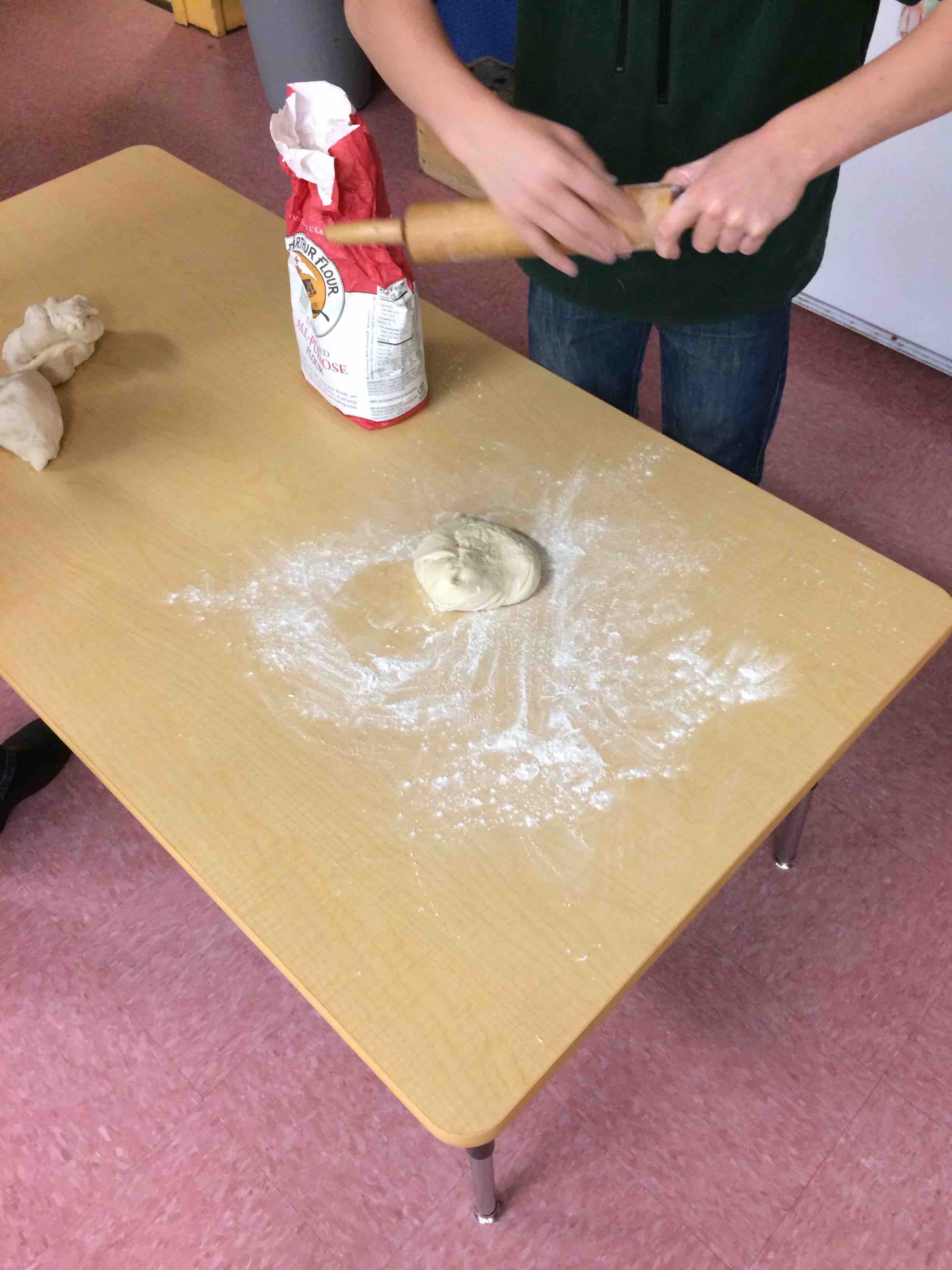 The rest of pizza making its just prep work: slicing whatever favorite veggies and cheeses go on top, rolling out the dough and spreading on the toppings. I use a rolling pin and a lot of elbow grease to make a thin pizza dough. Keep adding flour as your roll.The kids added some ground flint cornmeal to the greased pizza pans before putting the dough in. This gives the dough a cushion of air to rest on while cooking and helps it to become crisp.