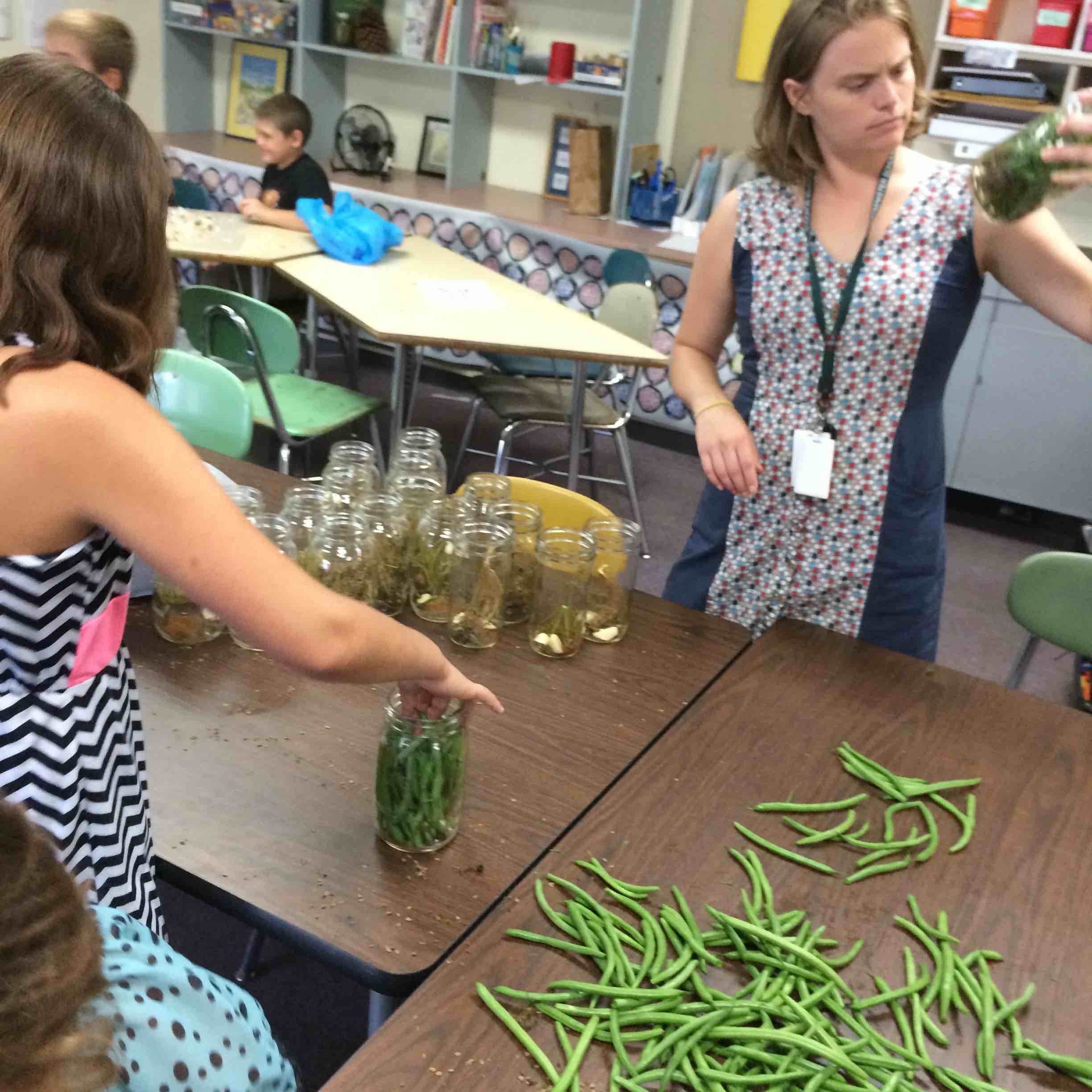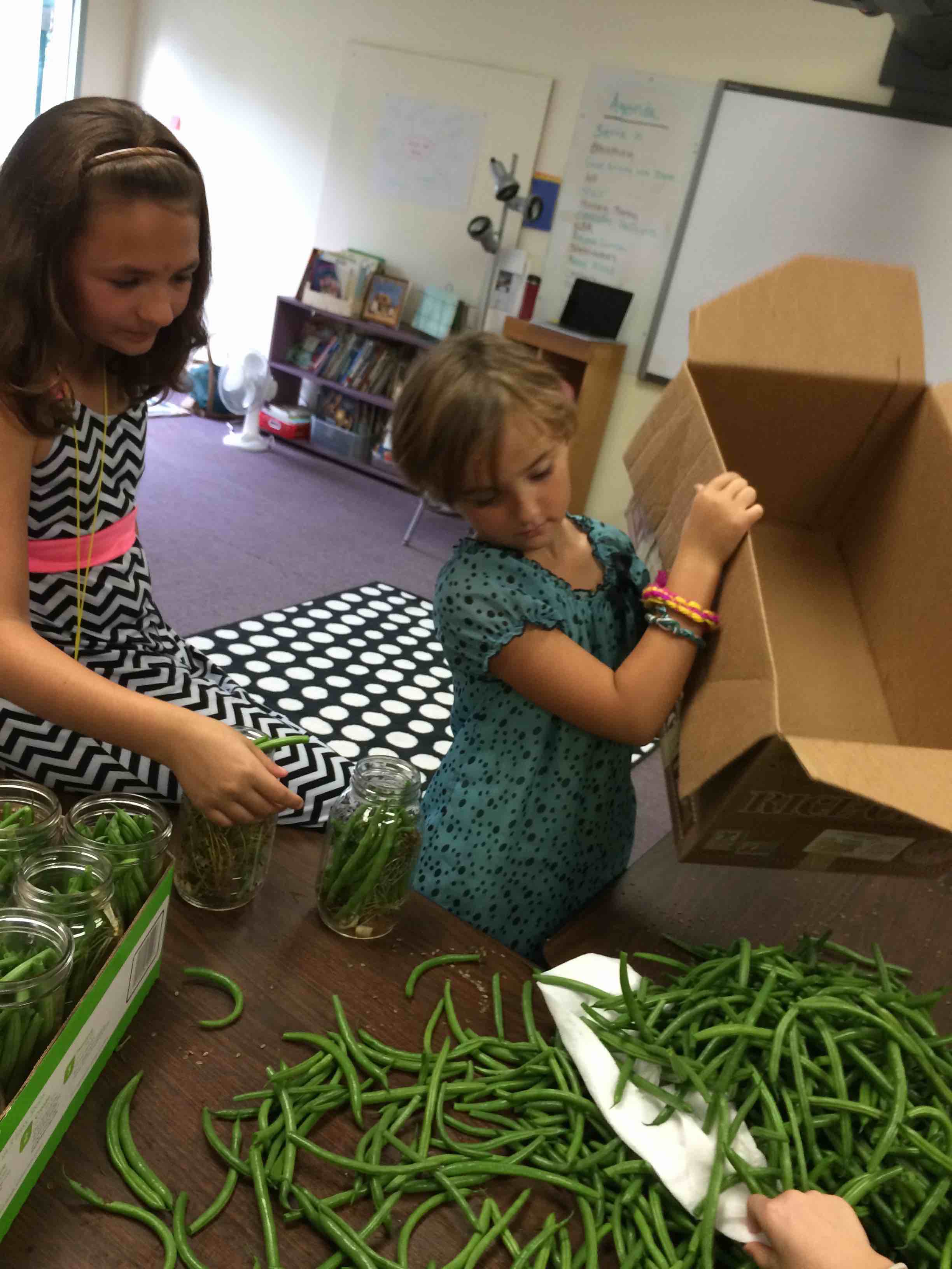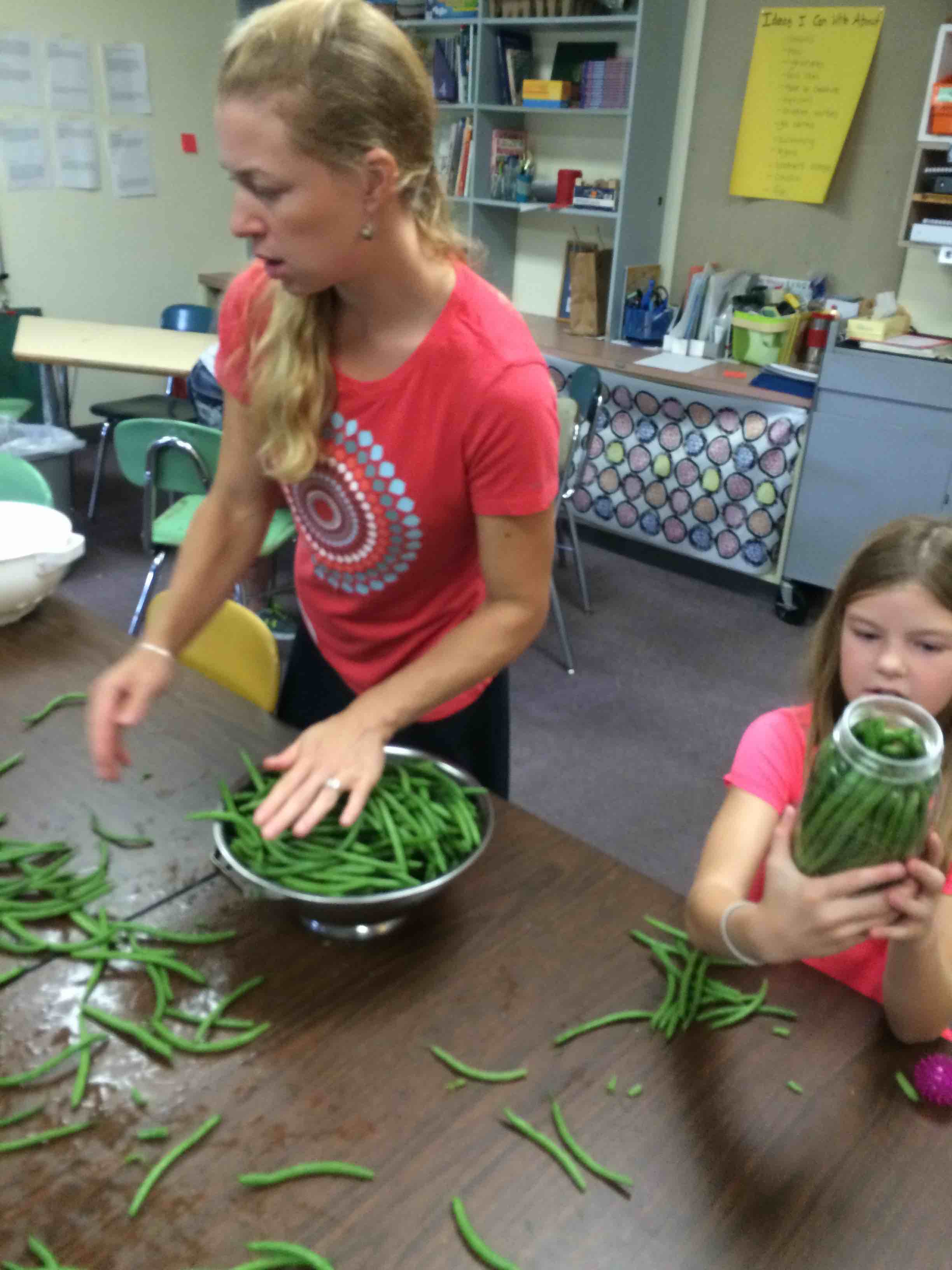 Last week, Liz Wing’s 4th grade worked as a team to prepare beans for pickling. They washed and sorted beans, snipped off the stems and stuffed them into canning jars. For spiciness, they added our own garden garlic and dill and a bit of dried cayenne pepper. The brine (kosher salt, vinegar and water) and canning water was heating up in the kitchen as the kids worked together in their classroom. After the brine was added, jars were sealed and processed in a boiling water bath for 10 minutes. The beans will be at their “pickley” yummiest in about two weeks. We had the best of adult help to speed us along. This class was ready to move to their next activity in 1 hour. They put up 24 quarts of dilly beans for the school to enjoy this winter. (Recipe from Putting Foods By)