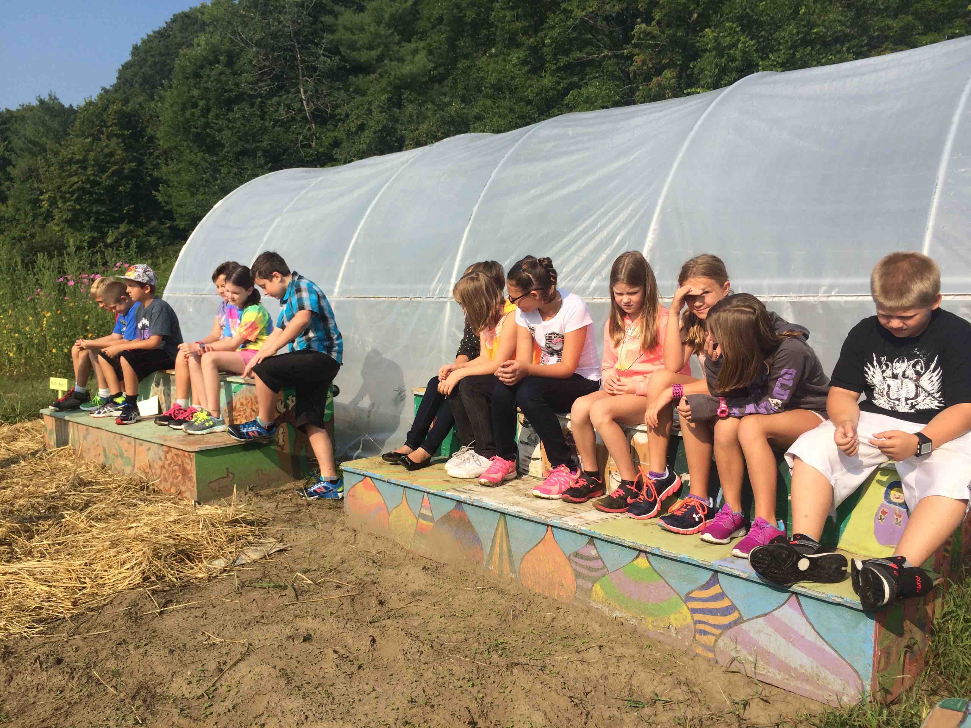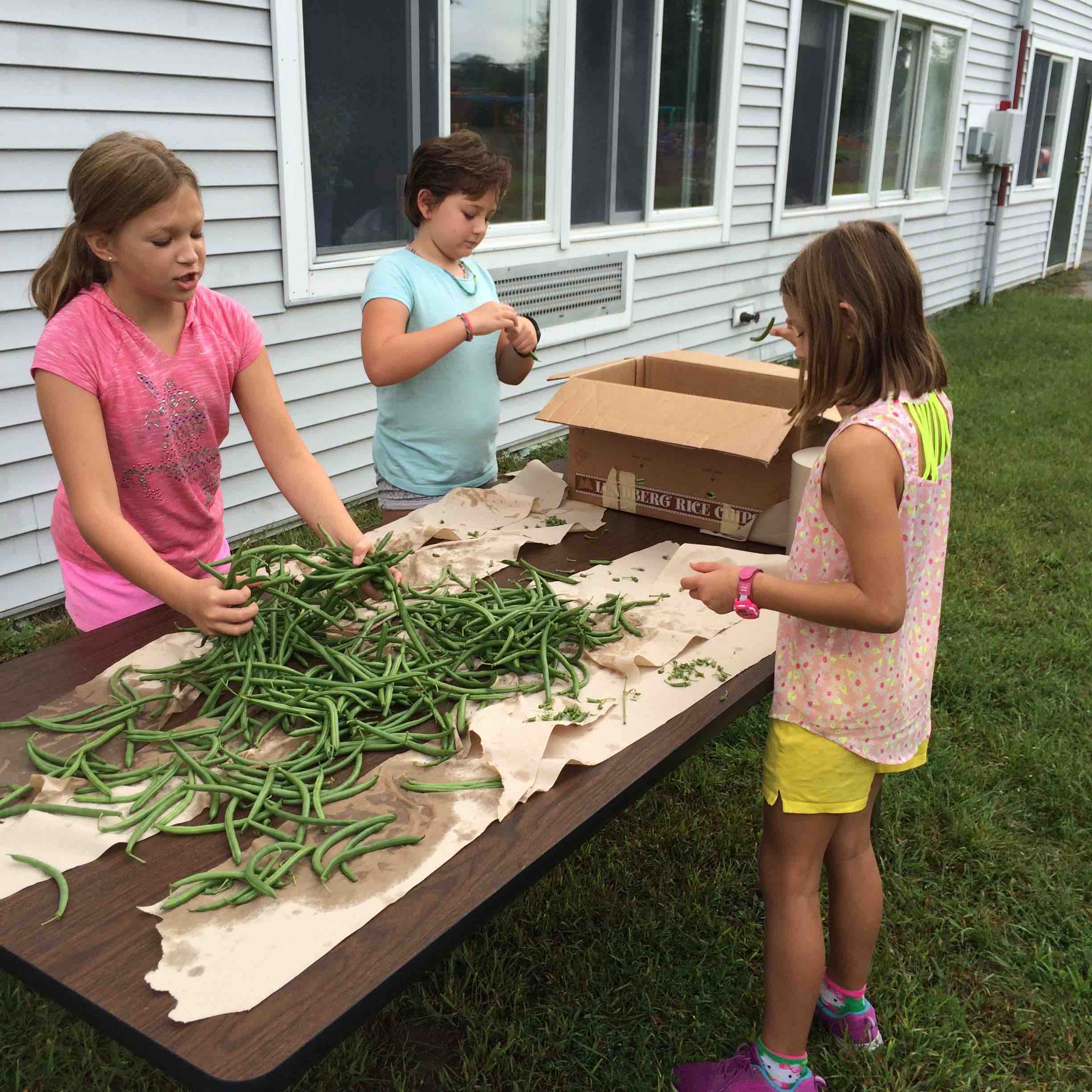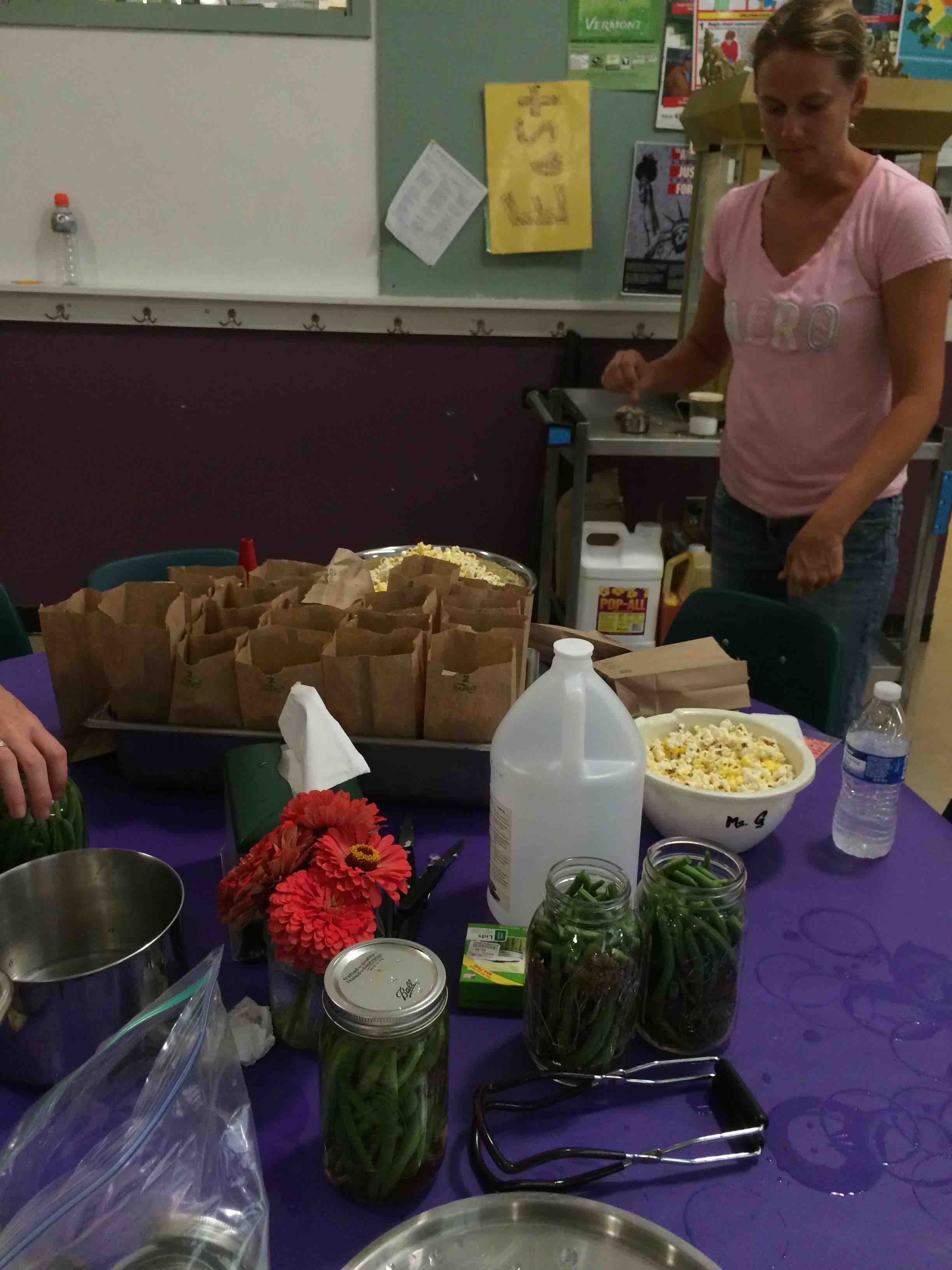 Last week, Liz Wing’s 4th grade worked as a team to prepare beans for pickling. They washed and sorted beans, snipped off the stems and stuffed them into canning jars. For spiciness, they added our own garden garlic and dill and a bit of dried cayenne pepper. The brine (kosher salt, vinegar and water) and canning water was heating up in the kitchen as the kids worked together in their classroom. After the brine was added, jars were sealed and processed in a boiling water bath for 10 minutes. The beans will be at their “pickley” yummiest in about two weeks. We had the best of adult help to speed us along. This class was ready to move to their next activity in 1 hour. They put up 24 quarts of dilly beans for the school to enjoy this winter. (Recipe from Putting Foods By)