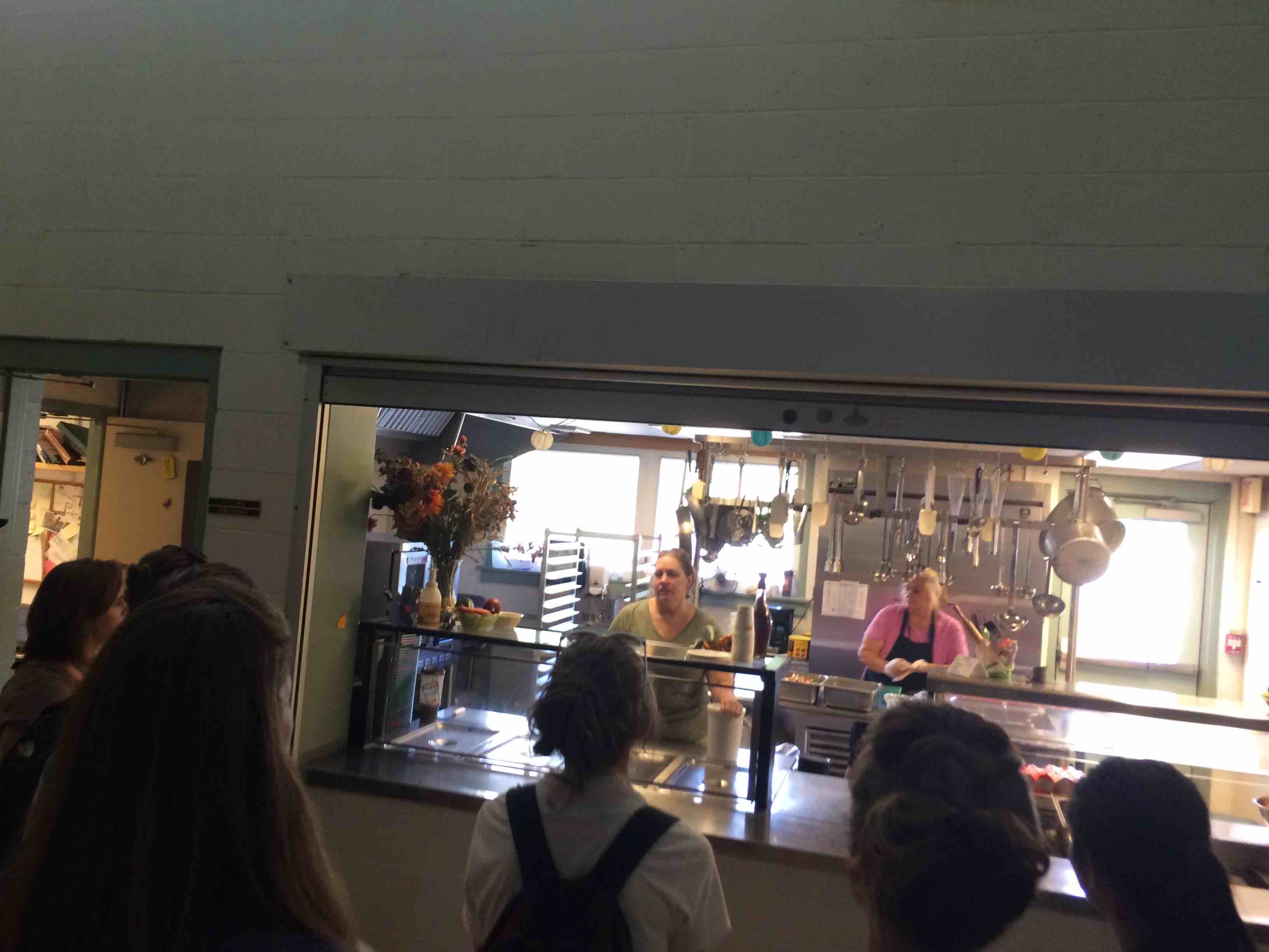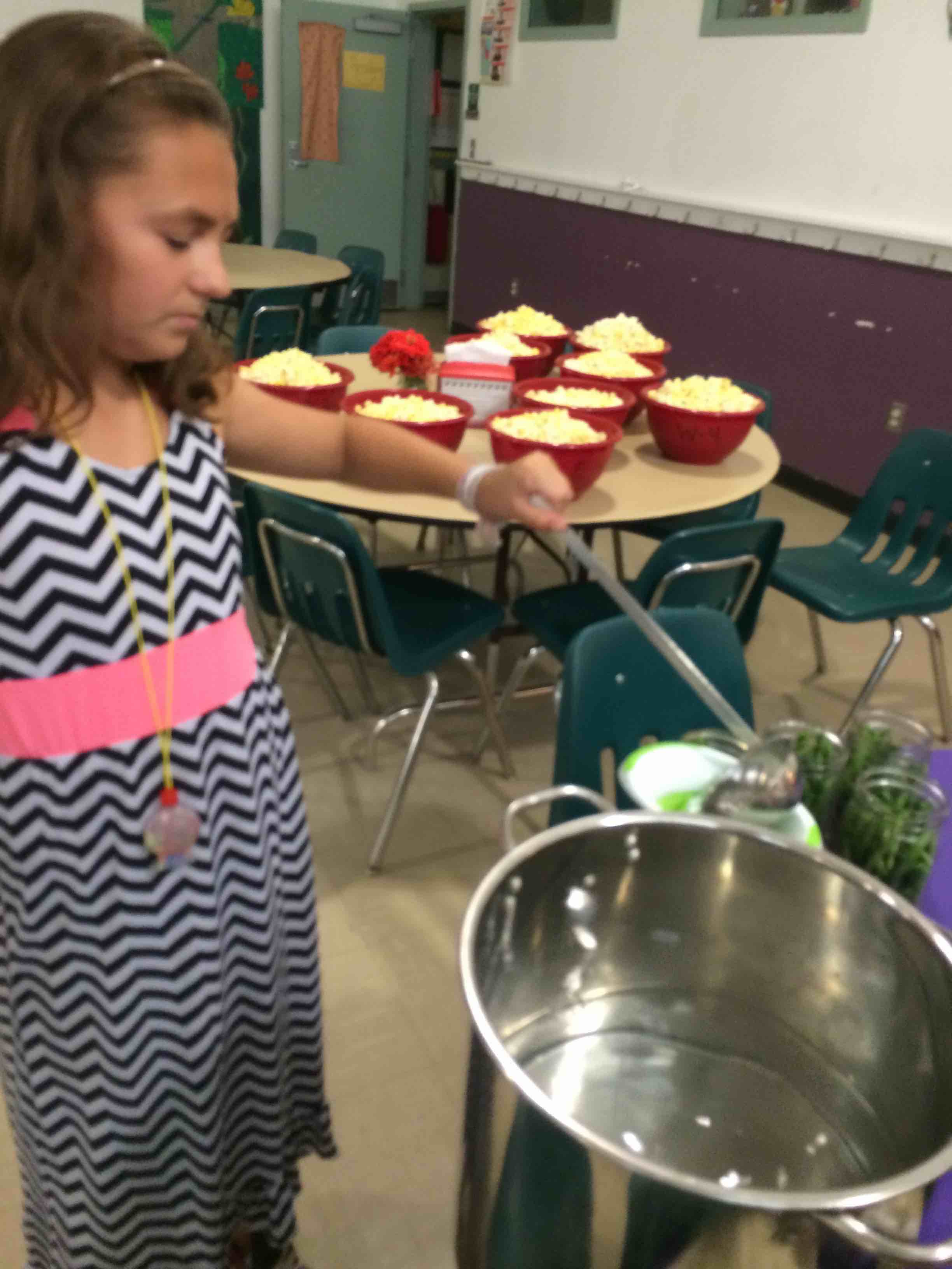 While we were adding brine in the cafeteria, our volunteer parent, Amy Rice Sciacca, was making popcorn for All School snack. (You can see the bowls of popped corn in the background.)