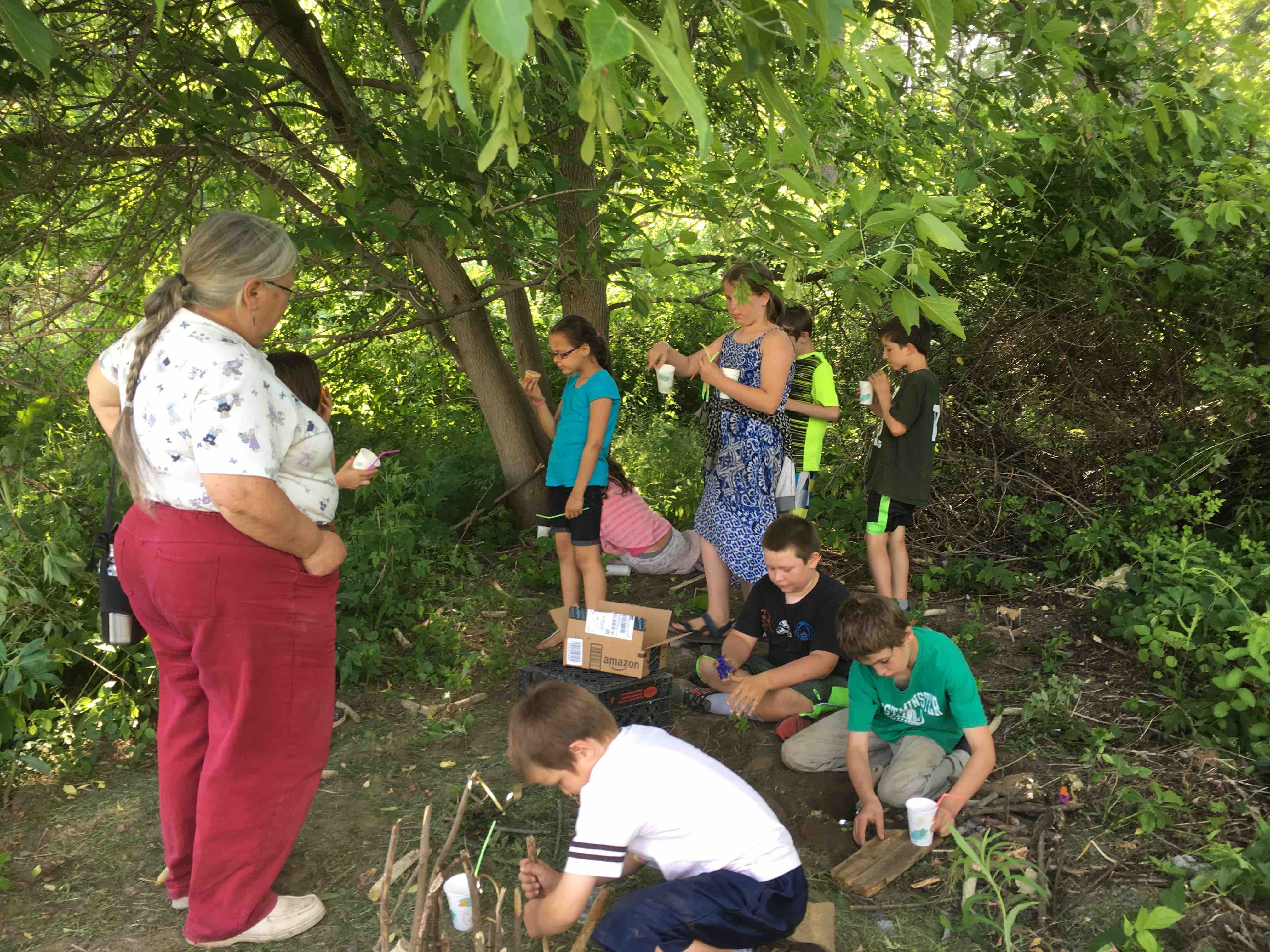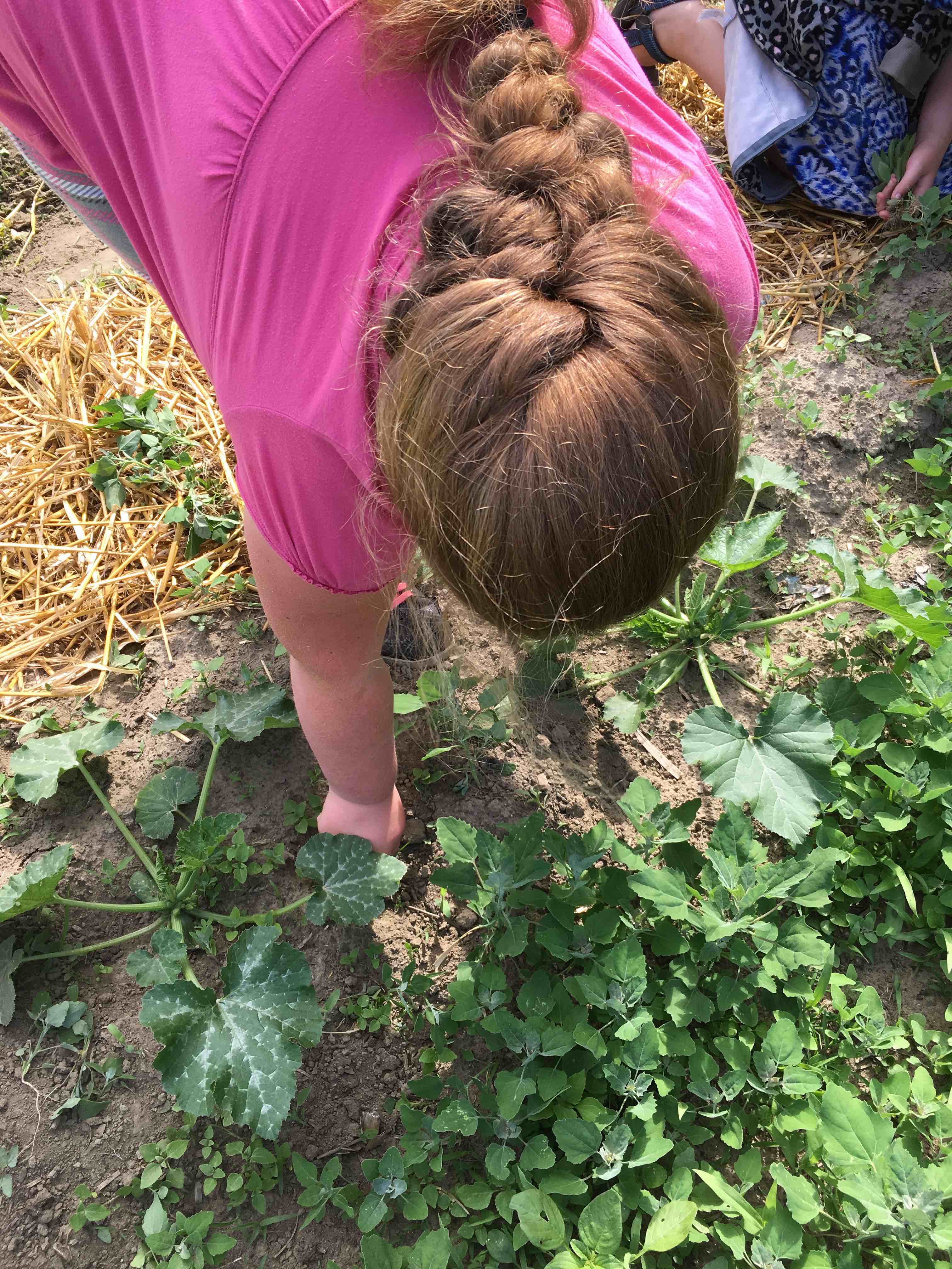 In the photo above, Nola and Sabin Sciacca and their Librarian and Garden Guide, Mandy Walsh are uncovering the heirloom squash the fourth graders planted last month. It’s amazing how fast weeds can overrun our garden. (Note the beautiful mulch straw in the background. We’ll put that down as soon as we uncover our plants. it should help keep the soil moist while discouraging weed growth.) Equally amazing is the work these two children put in for our garden. We’re lucky to have them. Here they are gathering zucchinis for our chef, Harley Sterling. He used them in his meal preparation that same day.