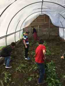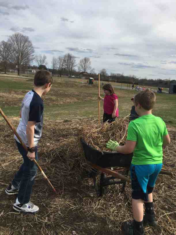 Among the chores for getting our garden ready was cleaning up the greenhouse. Thanks to our hard working custodian, Adam Hallock, we have a new cover for the school greenhouse. Mandy and a class had planted spinach that we discovered growing like a weed…a nice surprise for early April. We weeded it and took our harvest to the kitchen. Later we found it at the salad bar. Thanks, Chef Harley Sterling!
