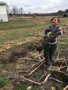 You can see that there was a lot to clean up from last year’s garden. We all worked together to create a big burn pile and then made a fire. (Please contact your local fire department before trying this.) First we dug a fire pit and made sure we had a hose at the ready. We also alerted our friends at the fire department.