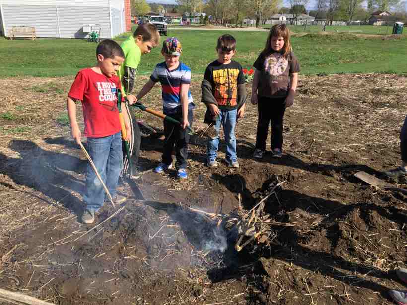 You can see that there was a lot to clean up from last year’s garden. We all worked together to create a big burn pile and then made a fire. (Please contact your local fire department before trying this.) First we dug a fire pit and made sure we had a hose at the ready. We also alerted our friends at the fire department.