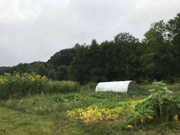 Here is our garden in all its splendor as the children viewed it when they came to visit during the first weeks of school. The rainy summer brought plenty of weeds. We had to make do with less help maintaining it than we’ve had in the past, but you can see a number of enduring crops decorating the landscape. In the foreground are kale and cucumbers. In the back you can see our popcorn and the sunflower house.