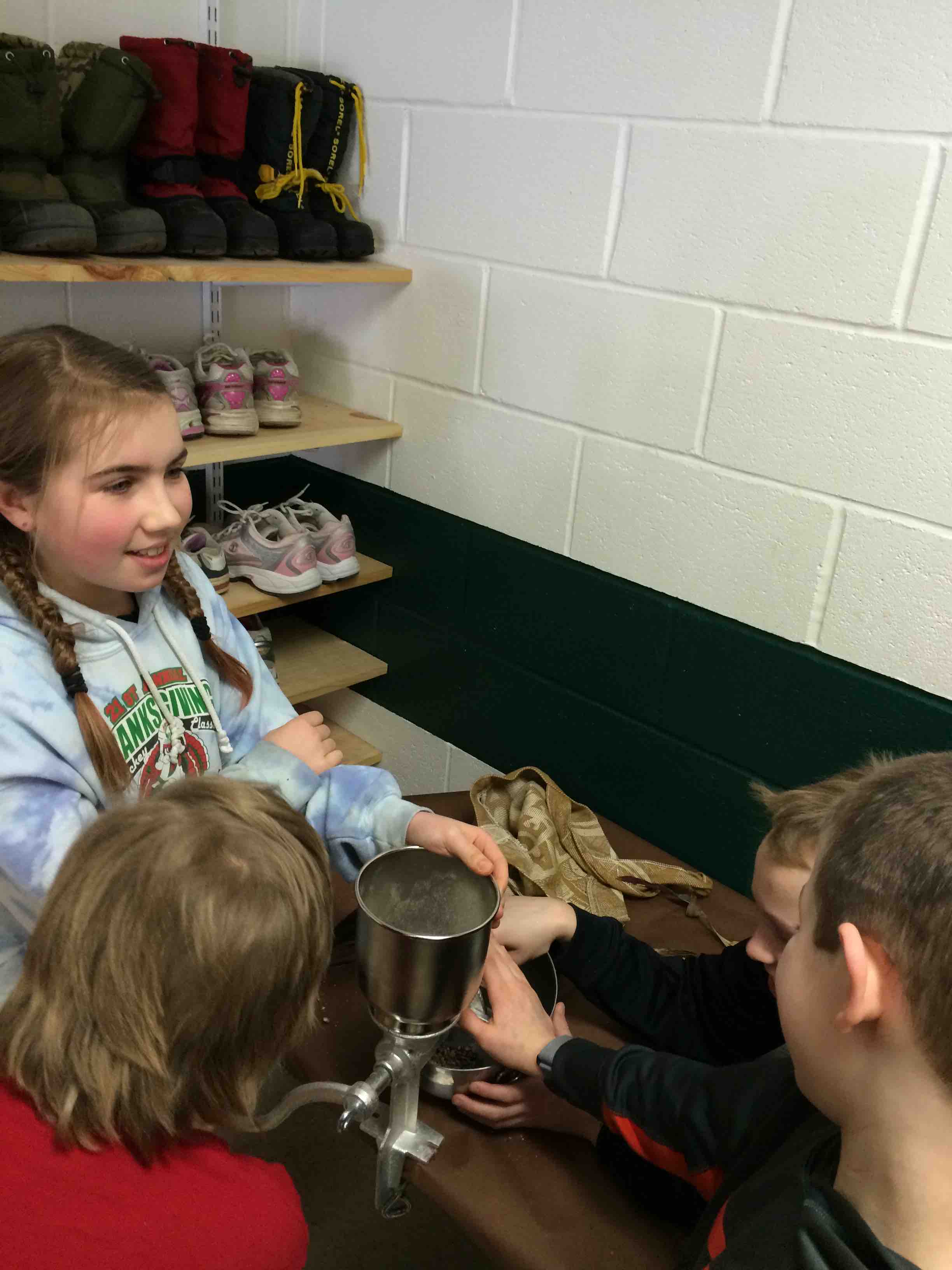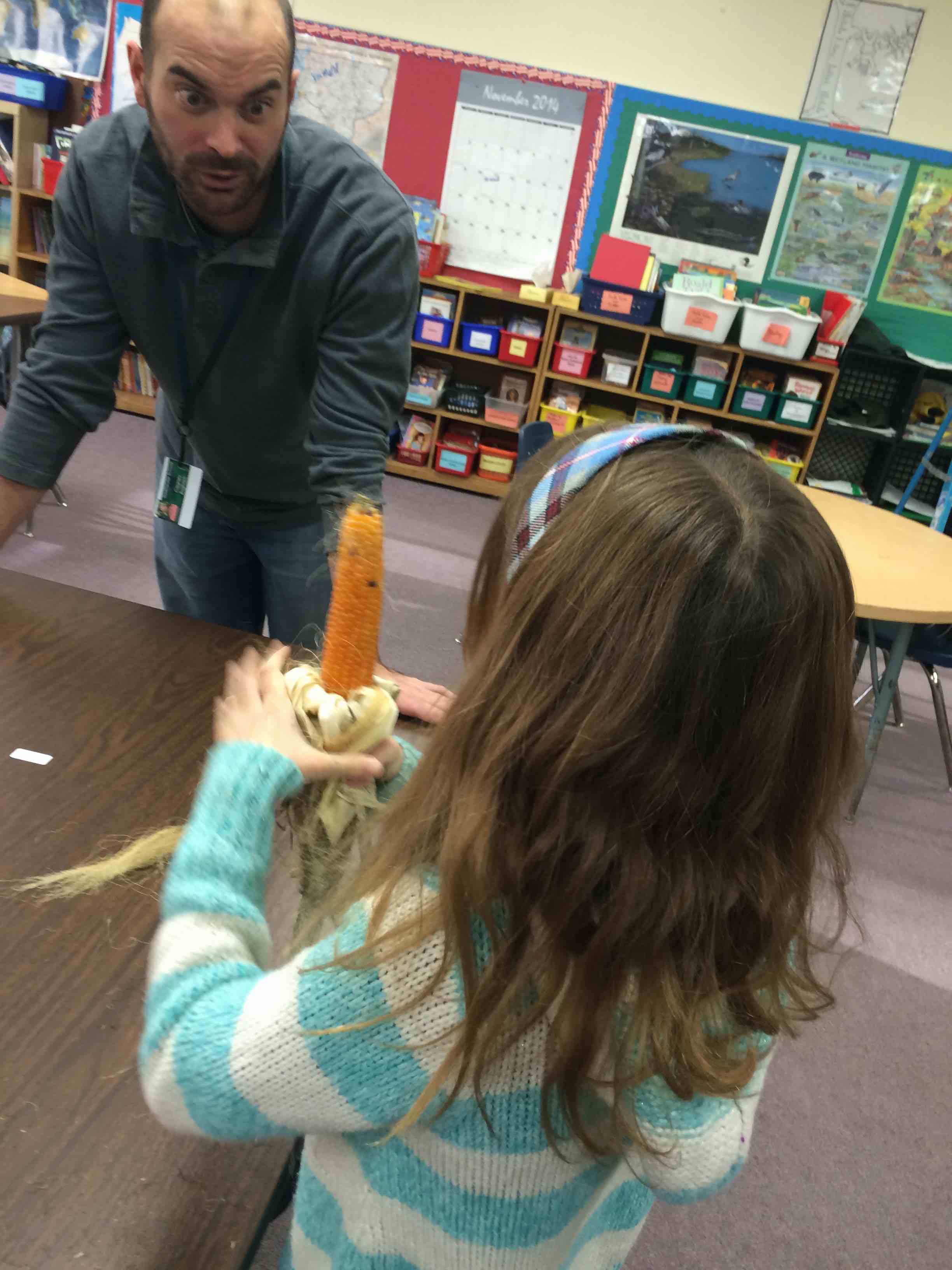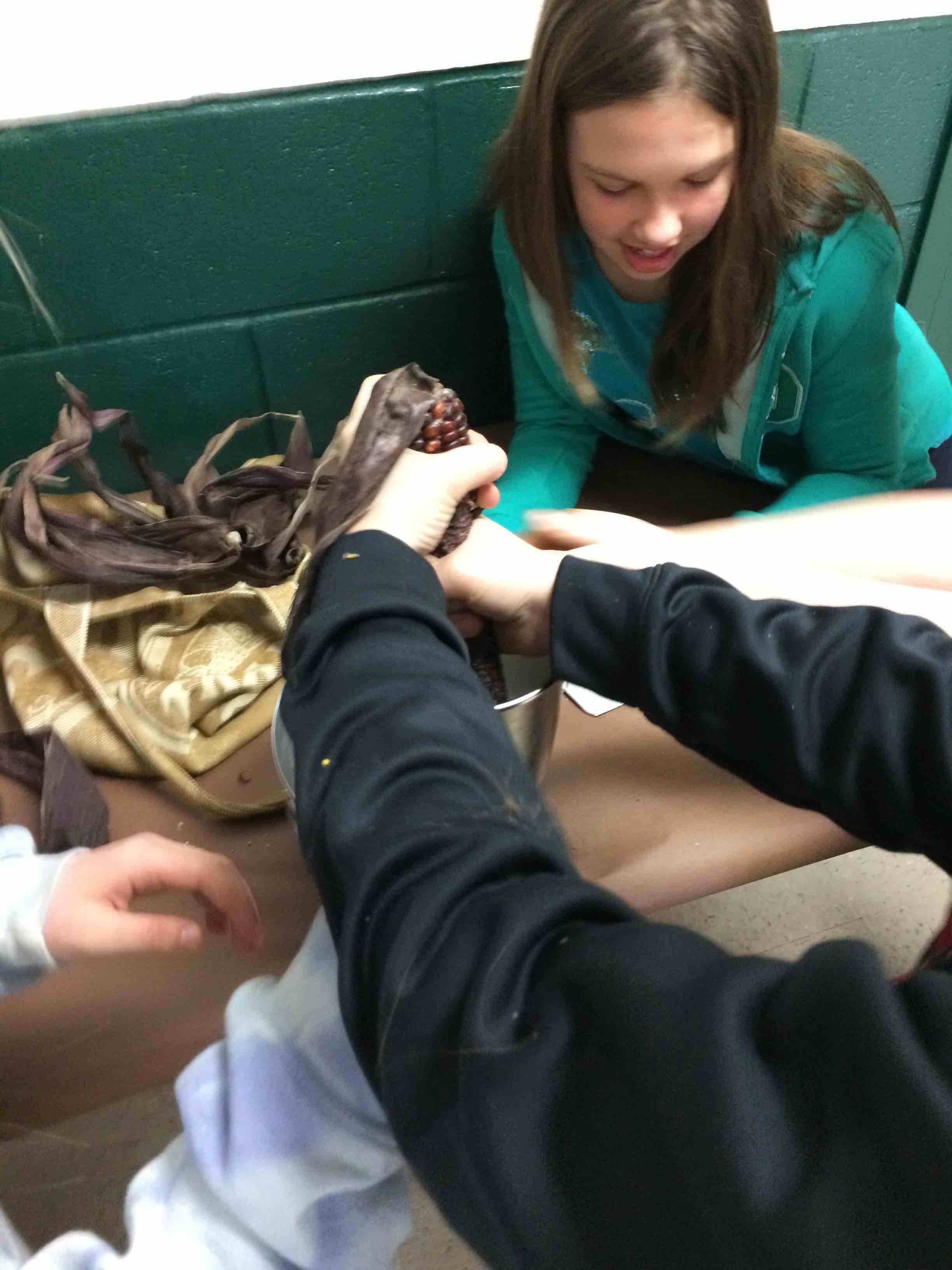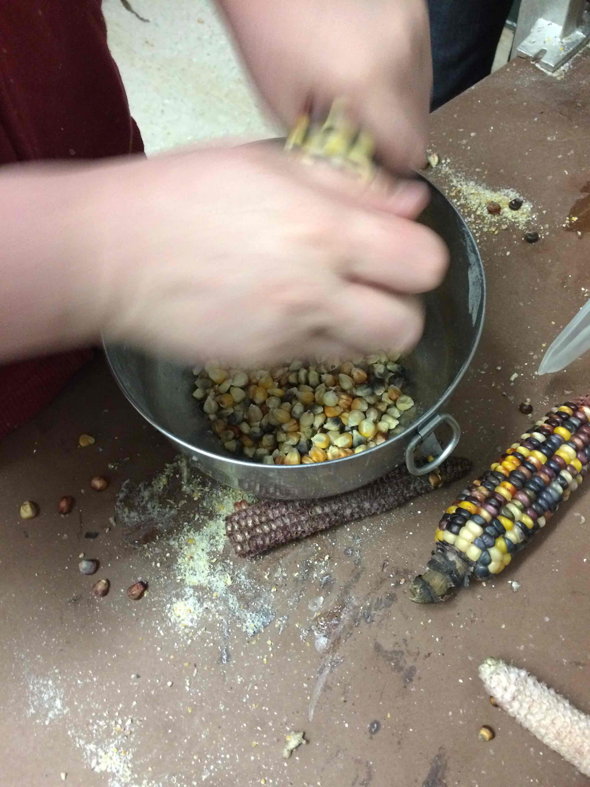 If you could look down into this hand crank mill, you would see an auger-like screw that feeds the hard flint corn kernels into the two grinding plates. Students in the fifth grade learned how this machine works and compared it to familiar uses (like the auger used to drill holes for ice fishing, or a farm combine). A quick ancient history lesson and a new/old term for the machine: the “Archemedean Screw,” accompanied a short physics lesson: