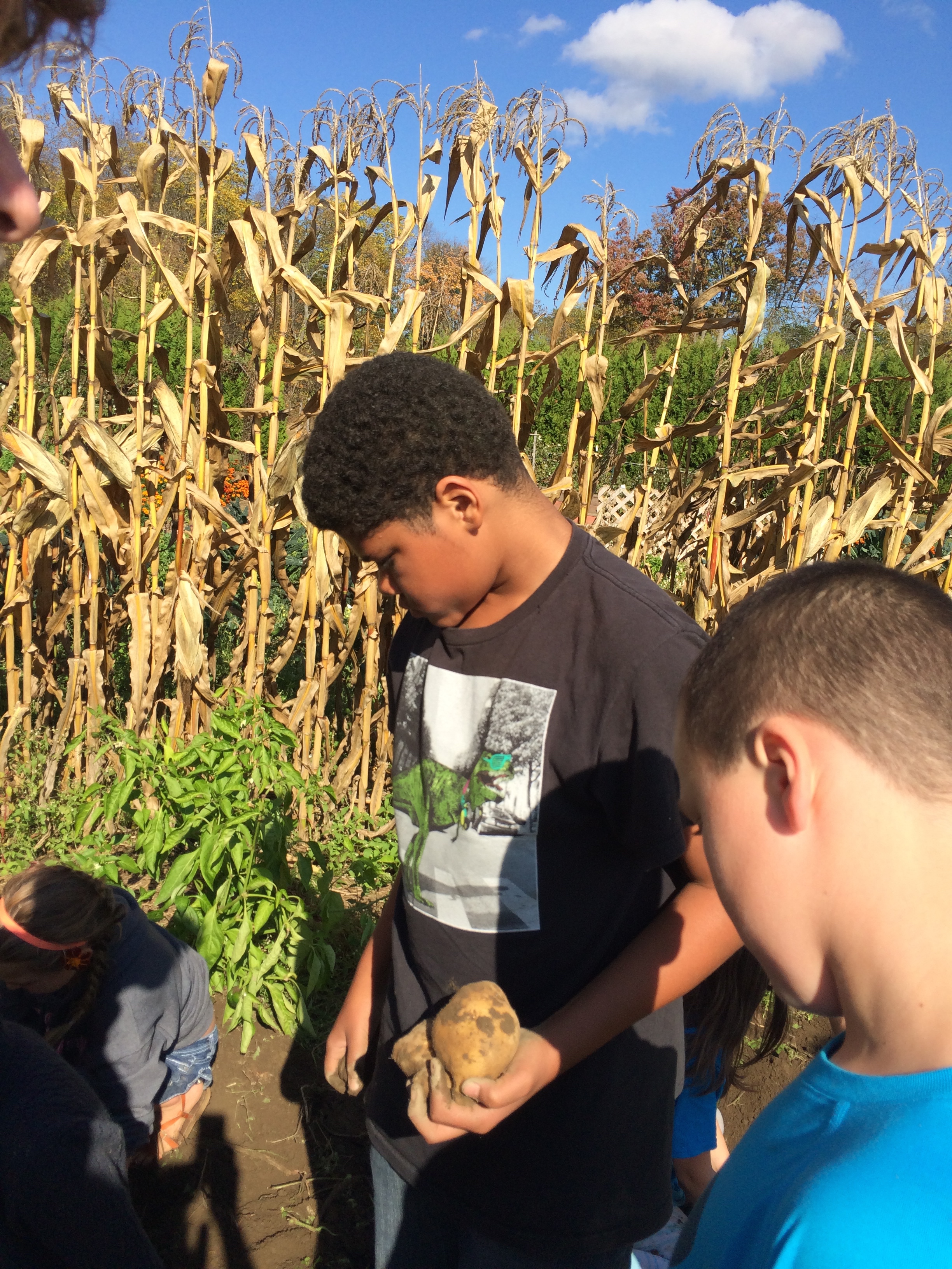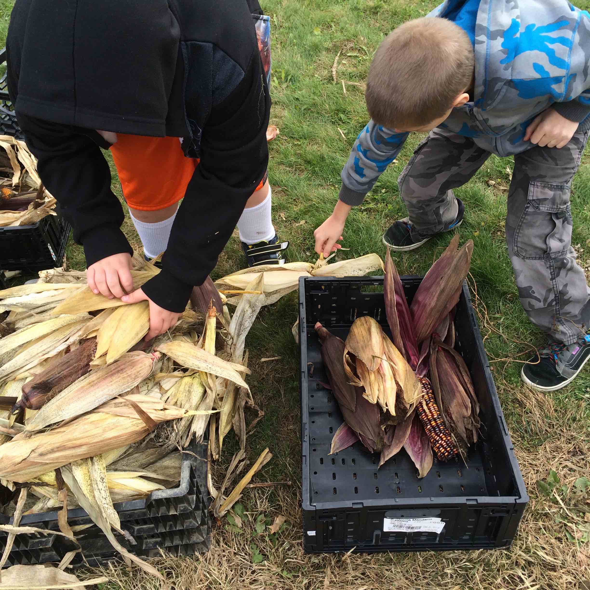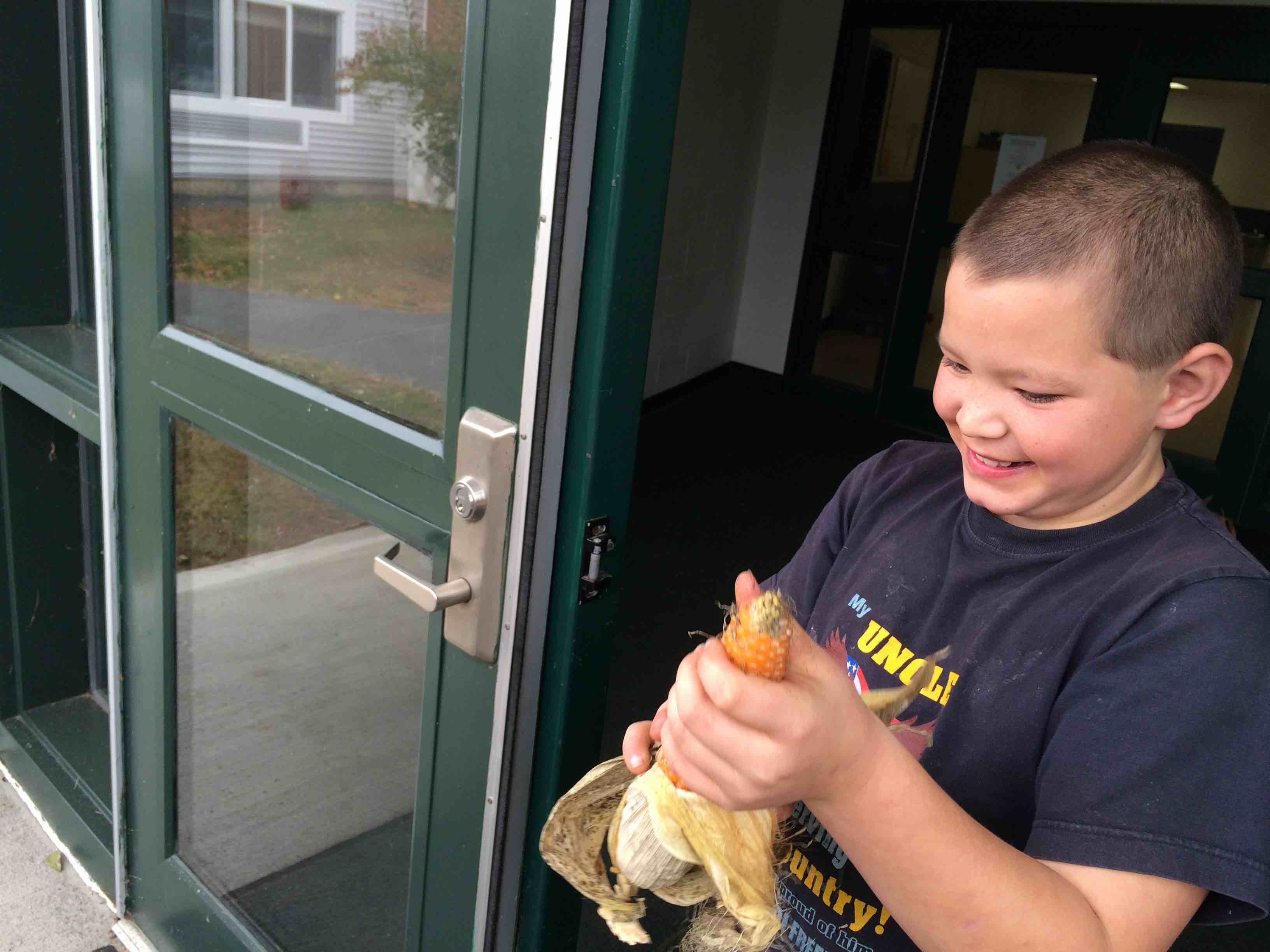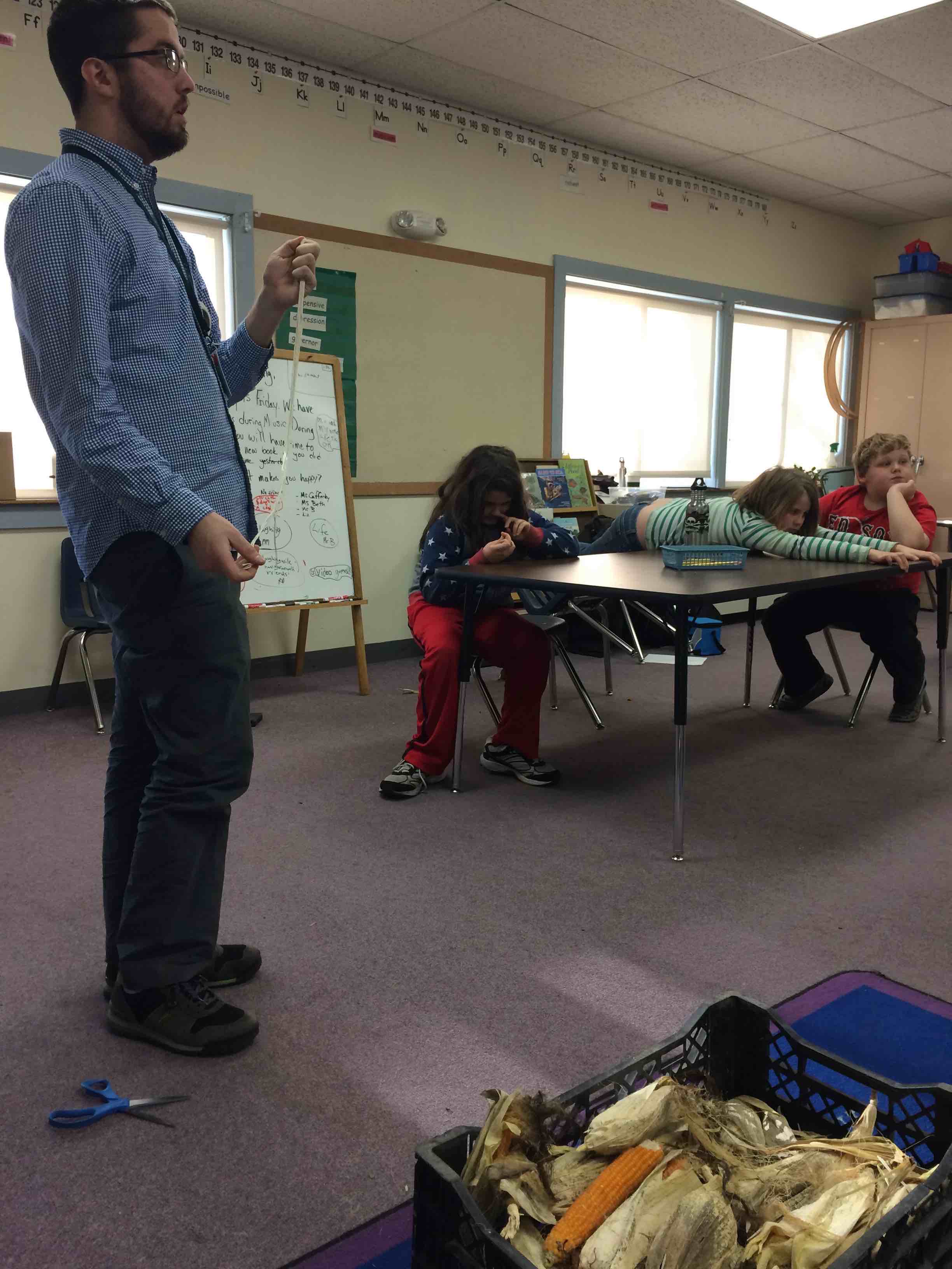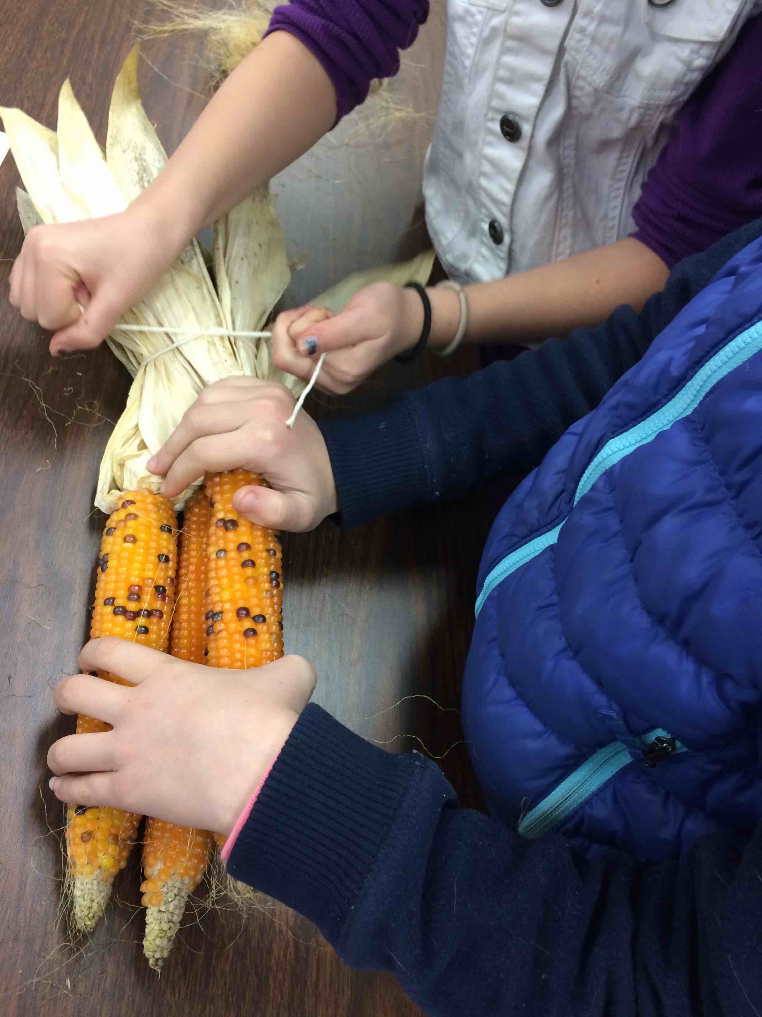 If you could look down into this hand crank mill, you would see an auger-like screw that feeds the hard flint corn kernels into the two grinding plates. Students in the fifth grade learned how this machine works and compared it to familiar uses (like the auger used to drill holes for ice fishing, or a farm combine). A quick ancient history lesson and a new/old term for the machine: the “Archemedean Screw,” accompanied a short physics lesson: