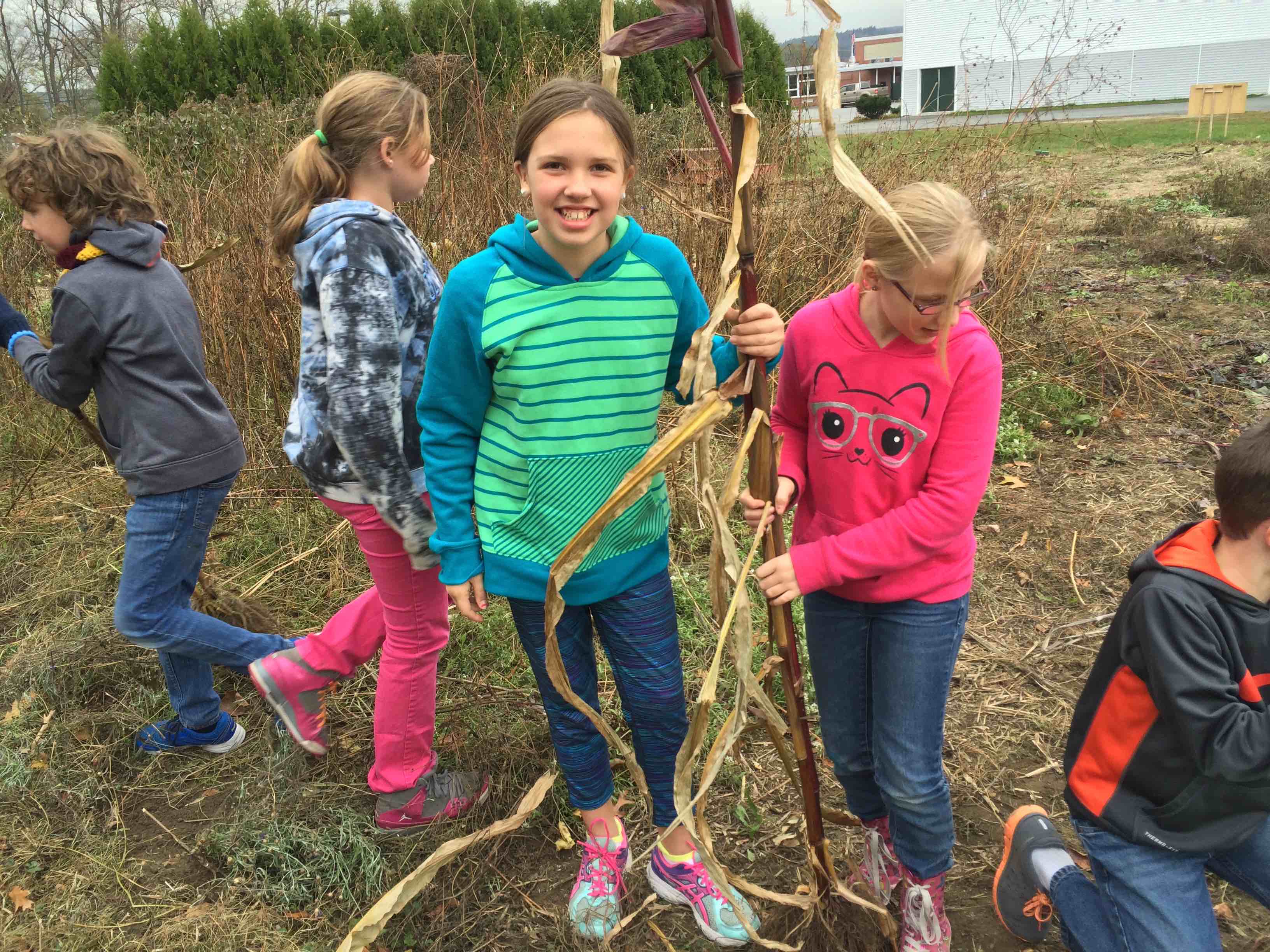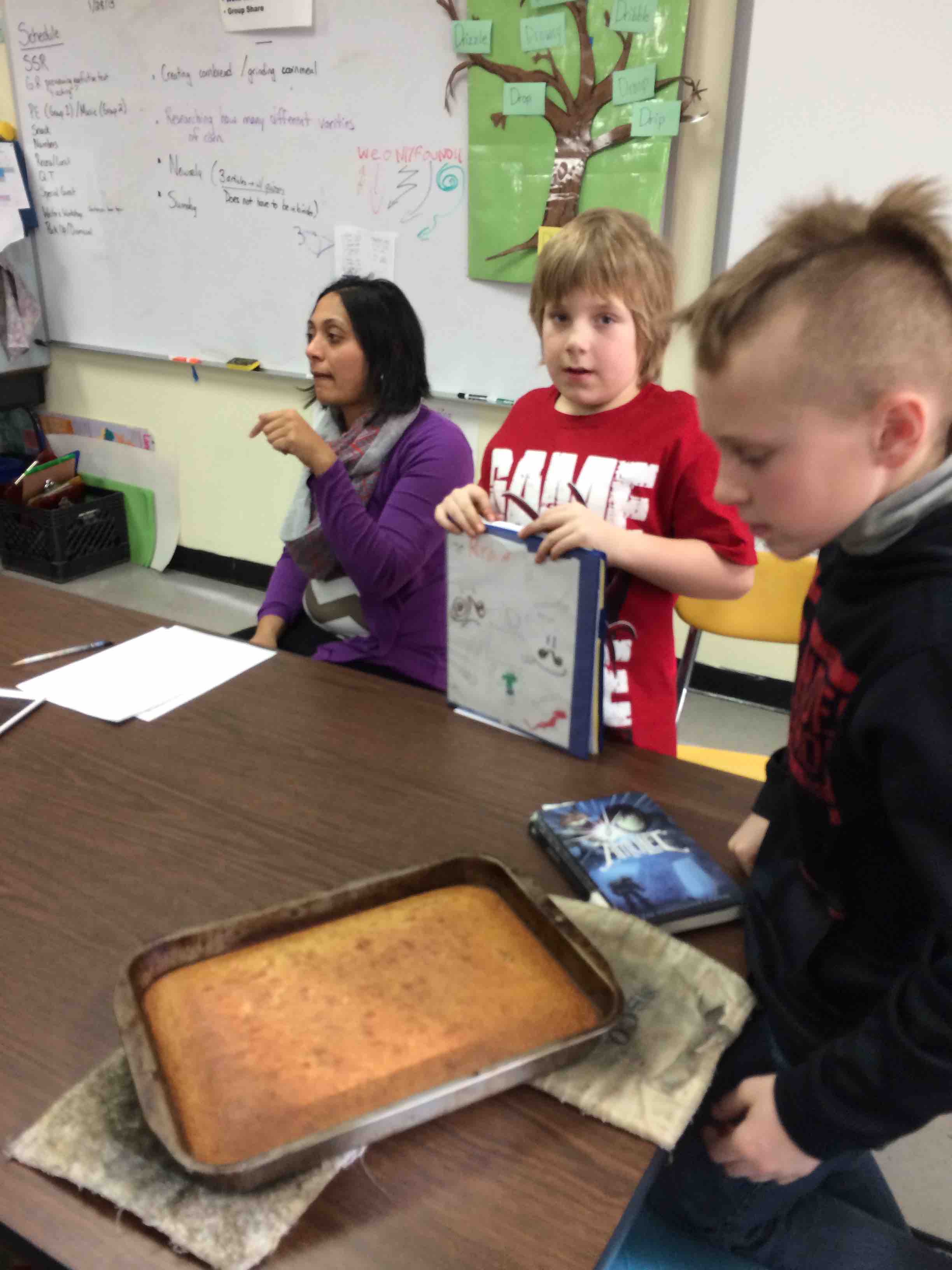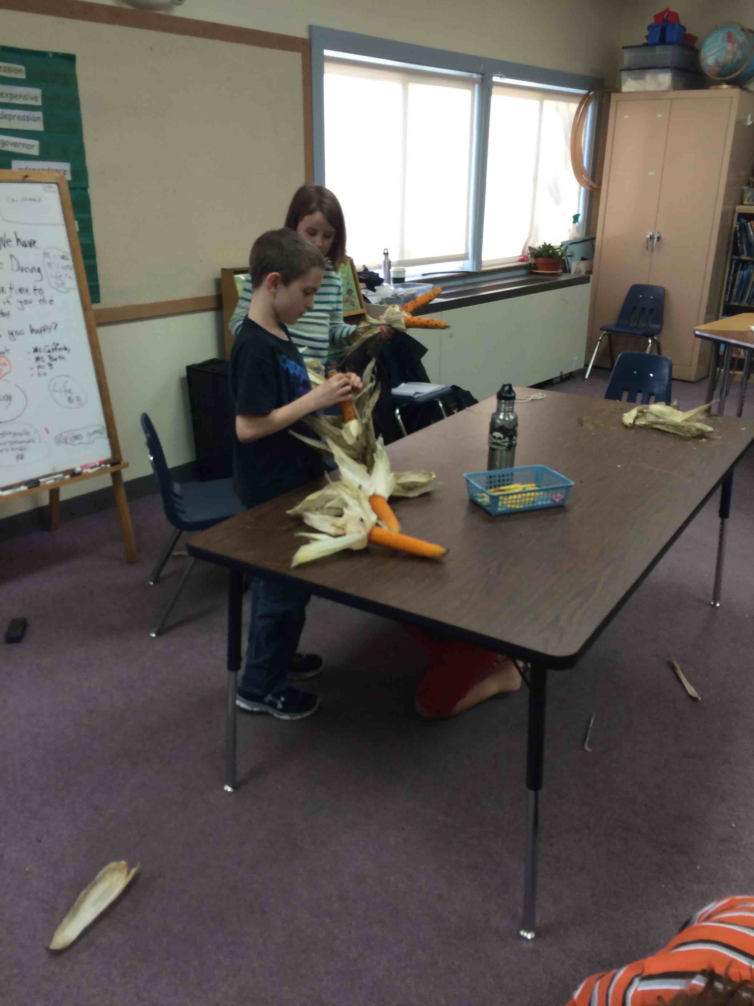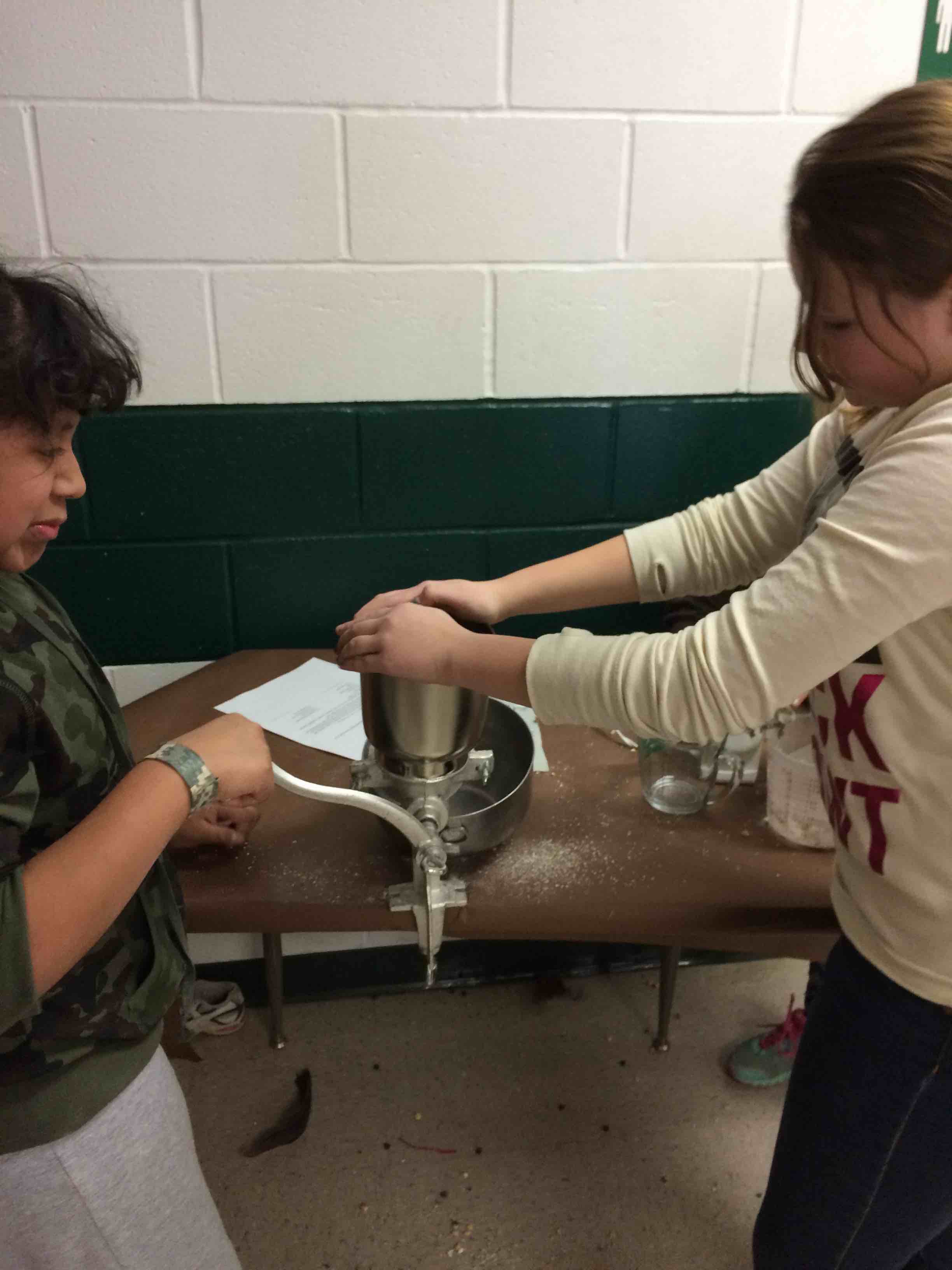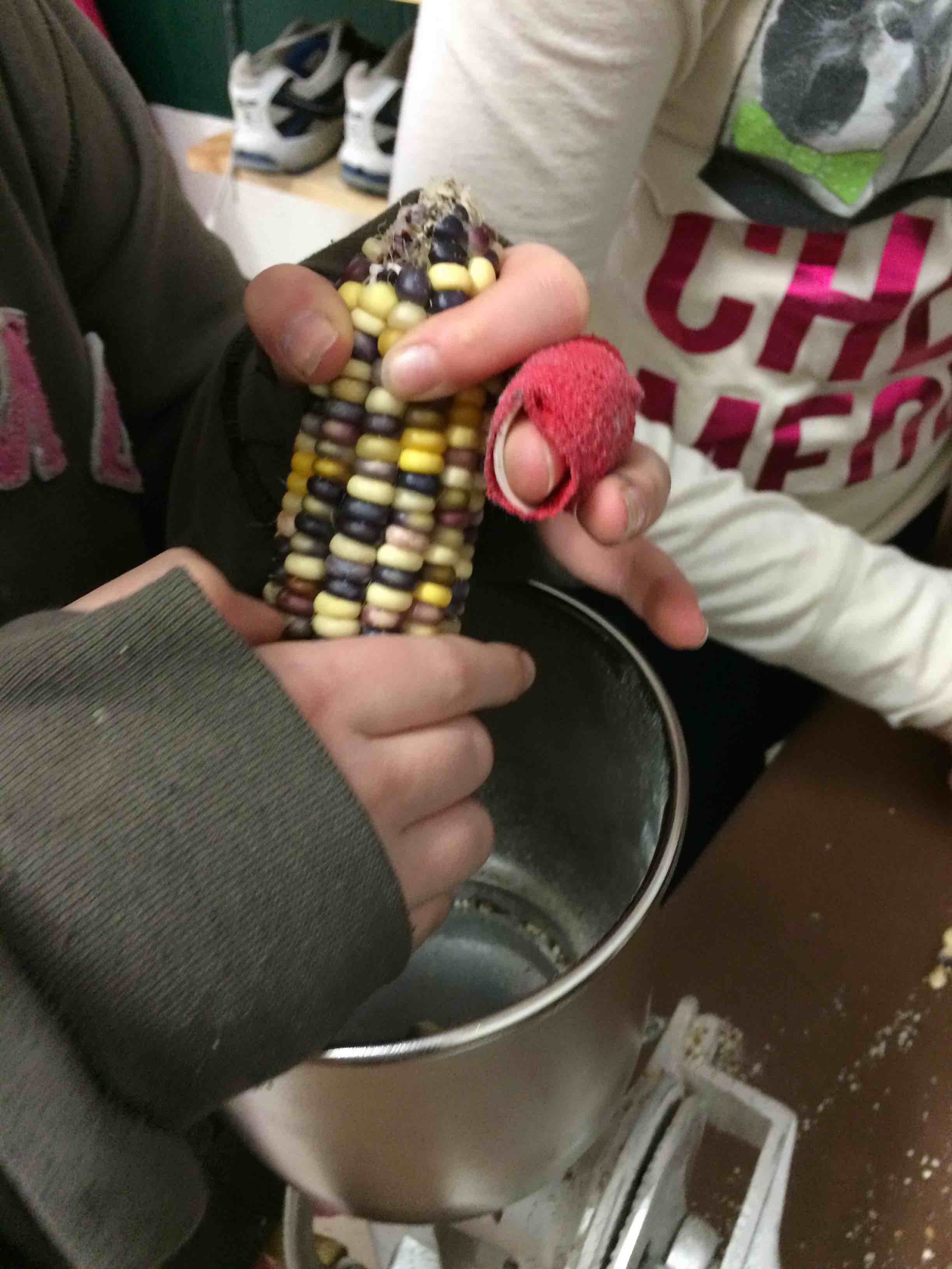 While they played with the name ‘Archemedean,’ fifth graders helped each other to hold the mill in place. Together they ground more than enough flint corn from our garden to make cornbread for their class. The recipe follows: