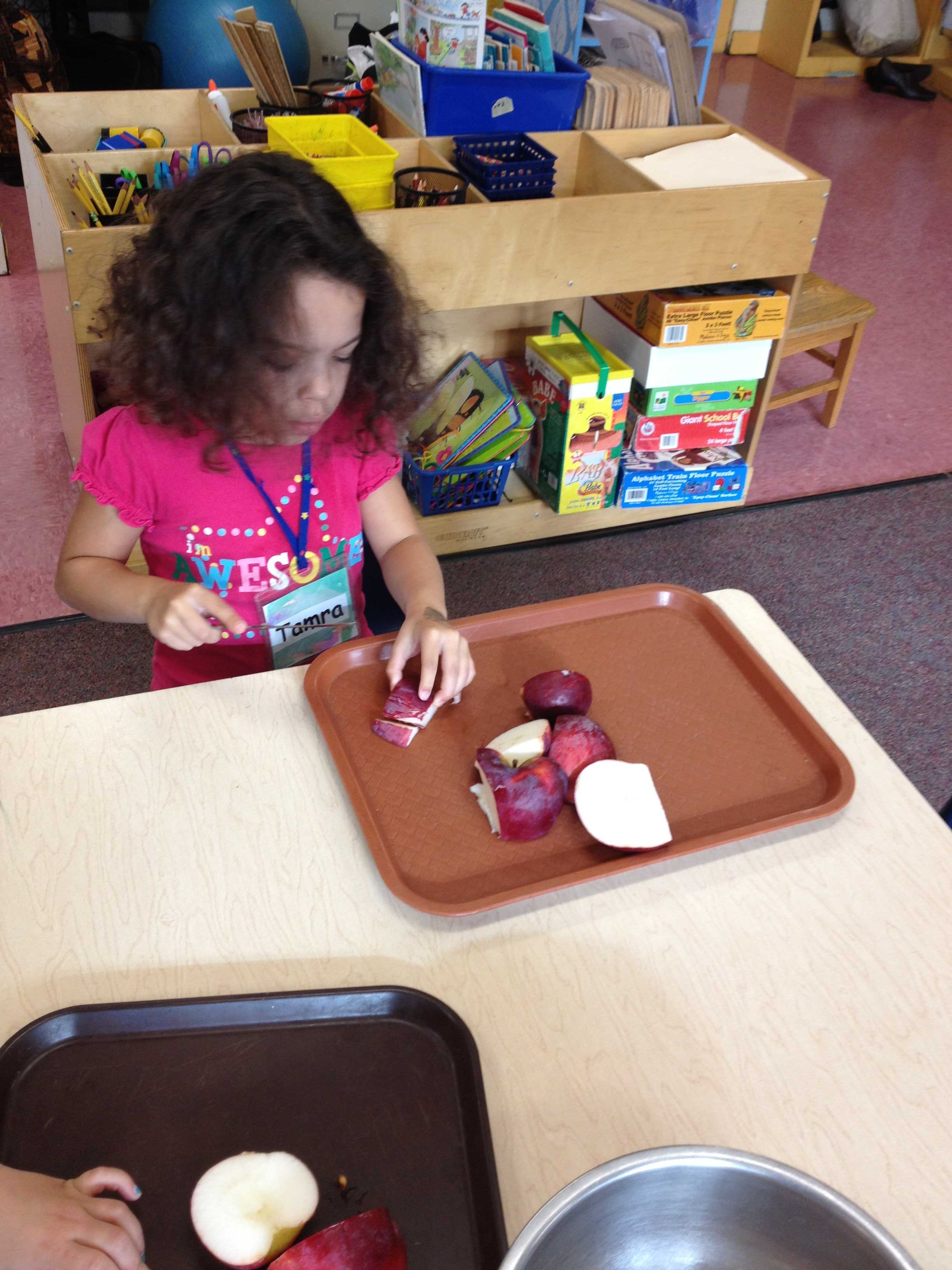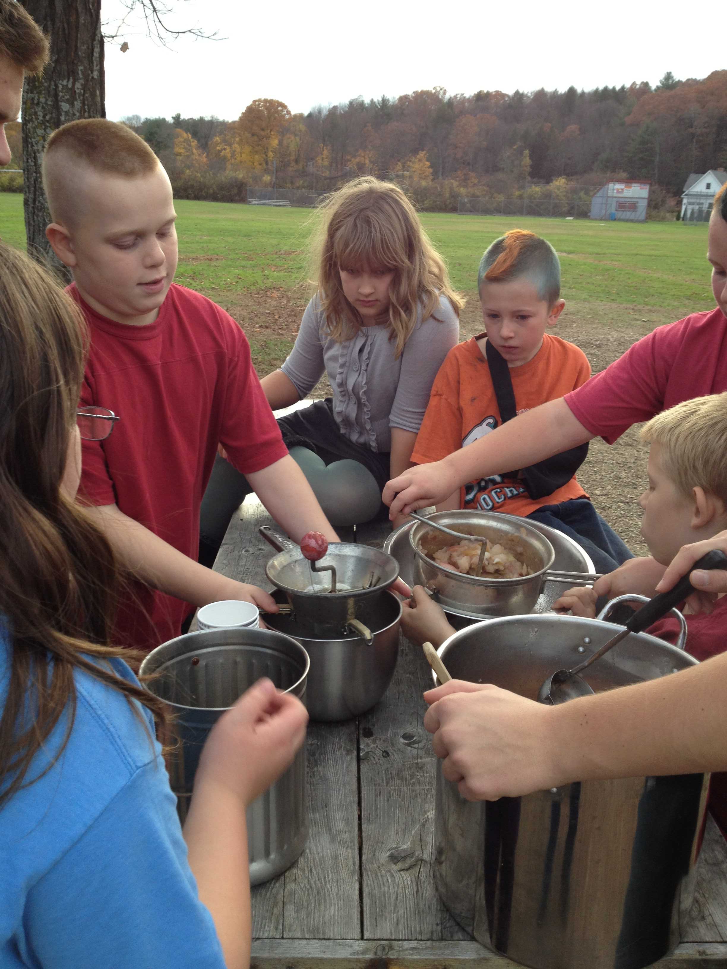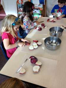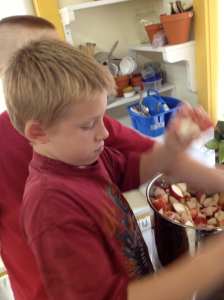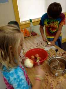 Each child participated in the steps to making one of the best treats of the season: crispy fried potato pancakes with apple sauce and sour cream. Mastery of the peeler and the grater was shared among those who were experienced and those who needed coaching.